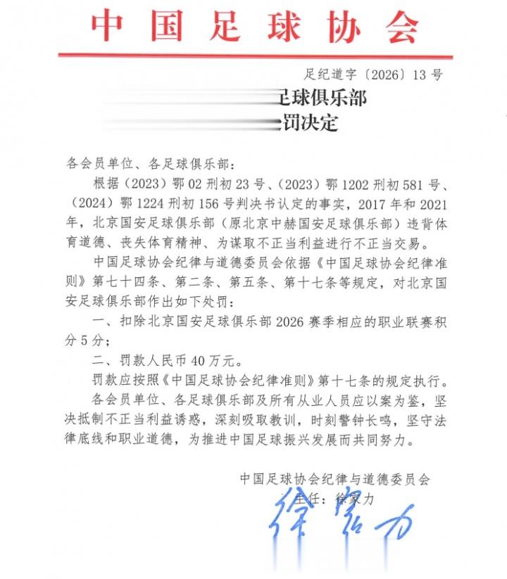 足协公布处罚公告,北京国安被扣5分+罚款人民币40万元。随后北京国安官方回应:“人在做,天在看!头顶三尺有神明!”