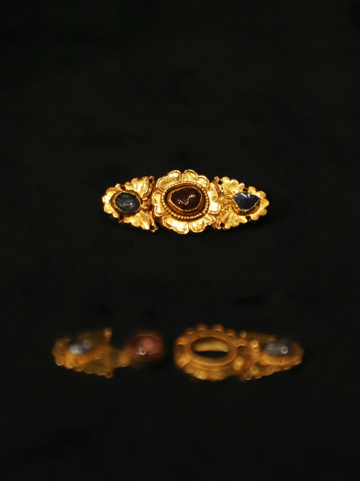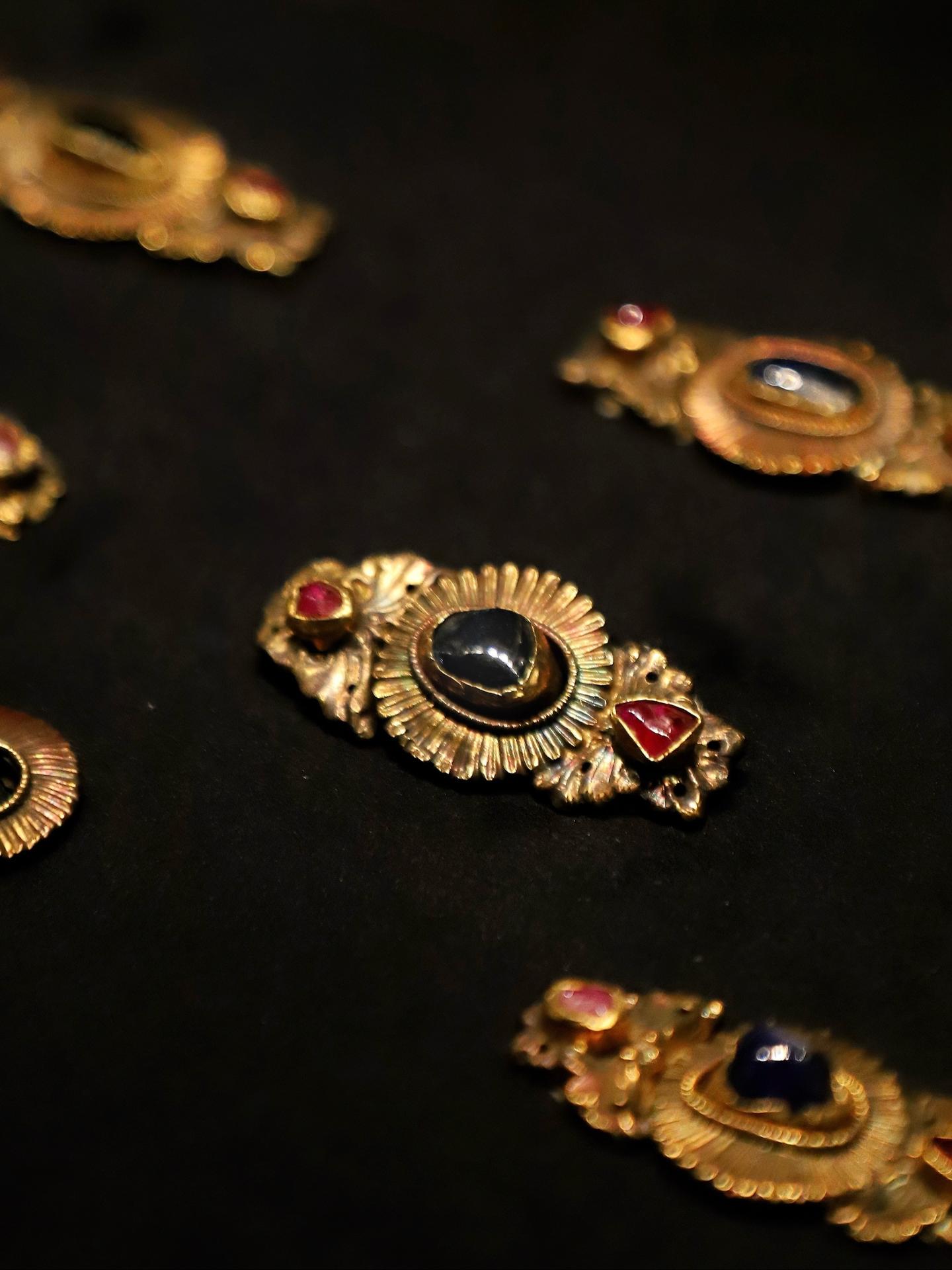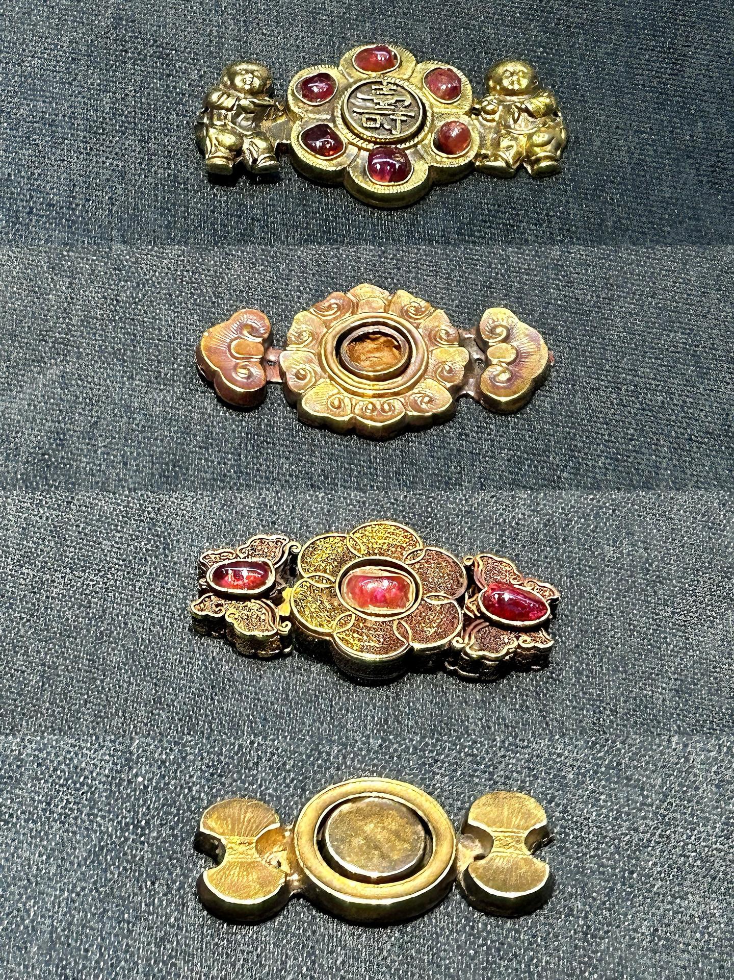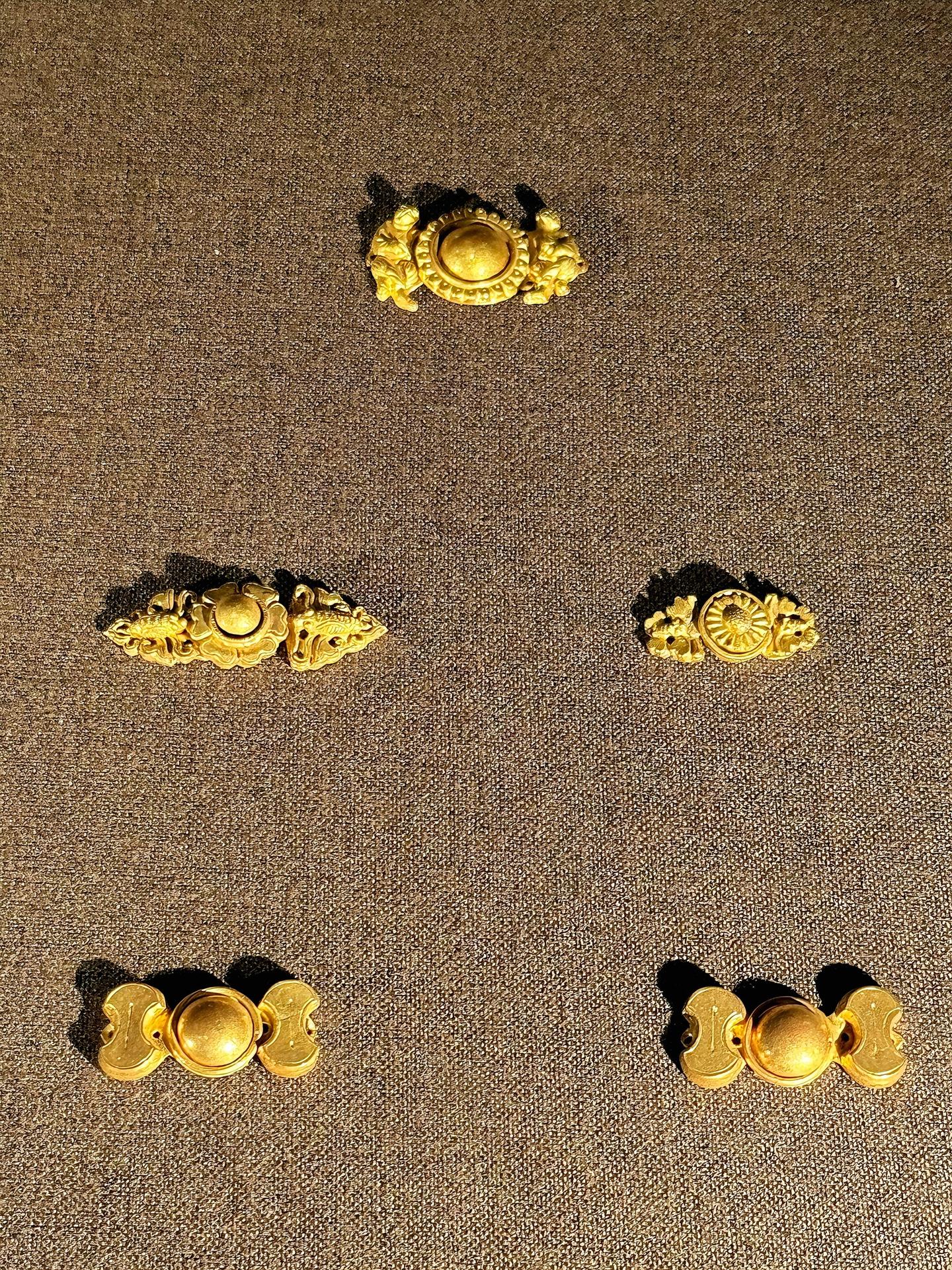明代诸多墓葬中都有出土用金、银、铜、玉、宝石等材质制作而成的扣子,多为子母套结式对扣,构造巧妙、造型丰富,会以植物纹、动物纹、人物纹装饰,承载吉祥圆满的美好寓意。