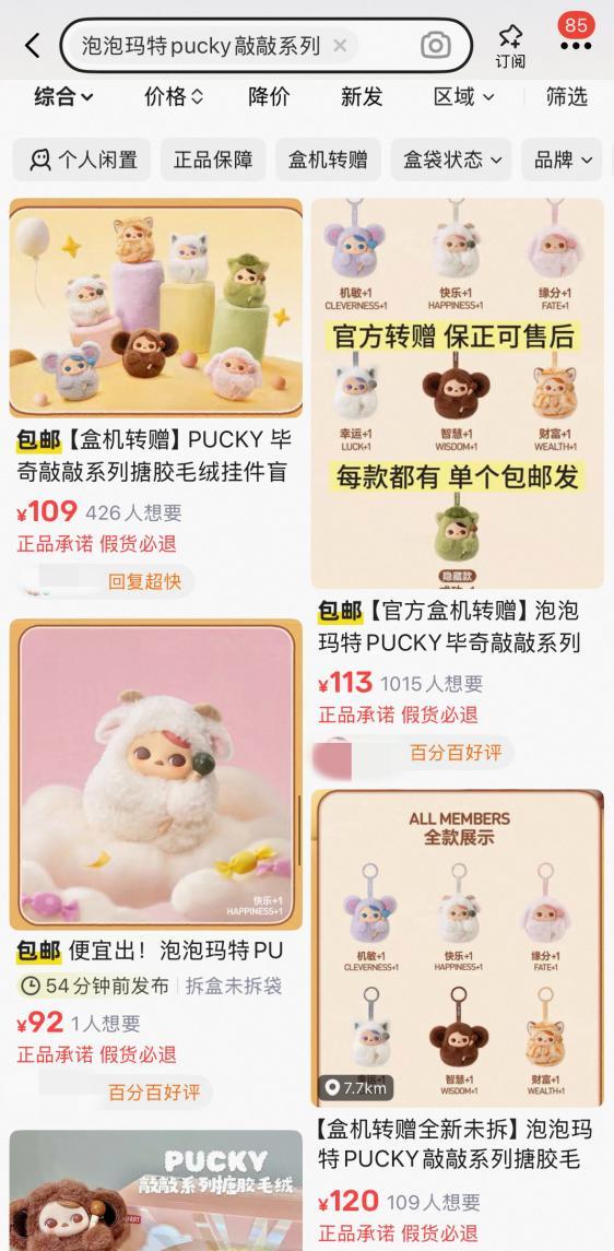 泡泡玛特小程序显示,“PUCKY敲敲系列”-搪胶毛绒挂件盲盒,高约9-11cm,挂绳(含挂环)7.5cm。该系列盲盒采用6款常规角色+1款隐藏款的配置,单个盲盒售价为99元,整盒(6个)售价为594元。目前,该系列在泡泡玛特小程序、天猫及京东旗舰店均显示已售罄,足见其市场热度。