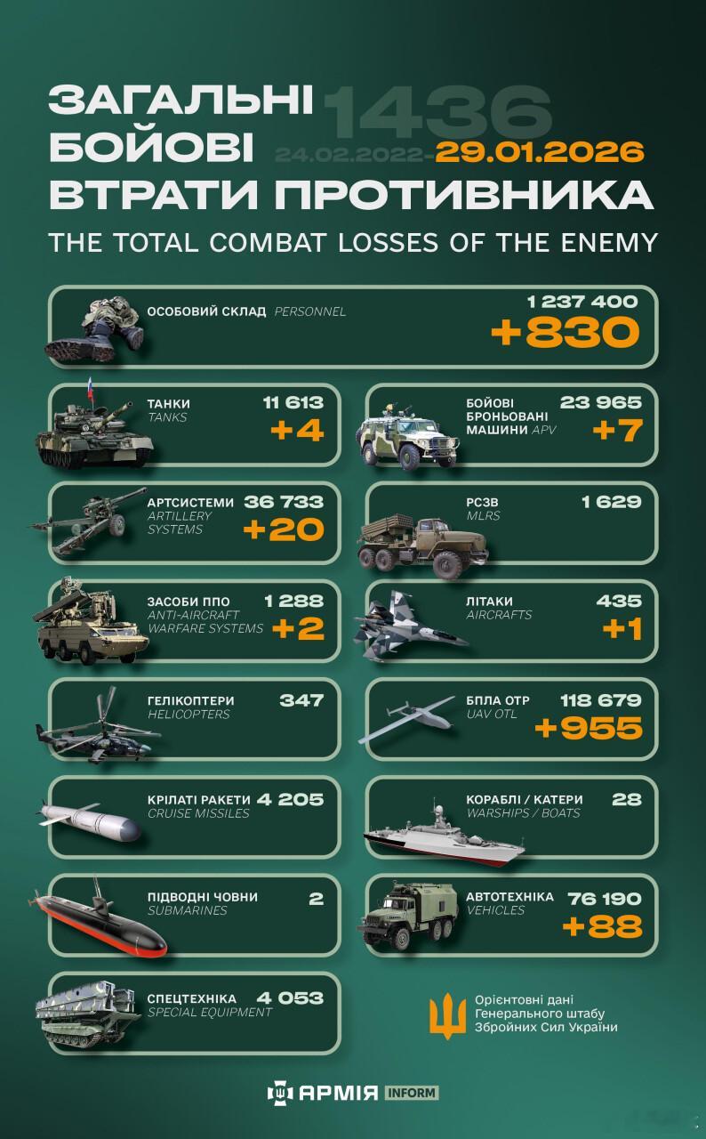 俄乌冲突 “世界第二军”俄罗斯只示范一次现代战争速度1小时22分又1436天乌克兰武装部队24小时又541天被驱逐出库尔斯克截至2026年1月29日“超级大国”俄罗斯损失战报约1237400头11613辆坦克23965辆装甲车36733门火炮1629门多管火箭炮1288套防空系统435架飞机 347架直升机118679架无人机4205枚导弹28艘军舰2艘潜艇76190辆汽车4053套特殊装备