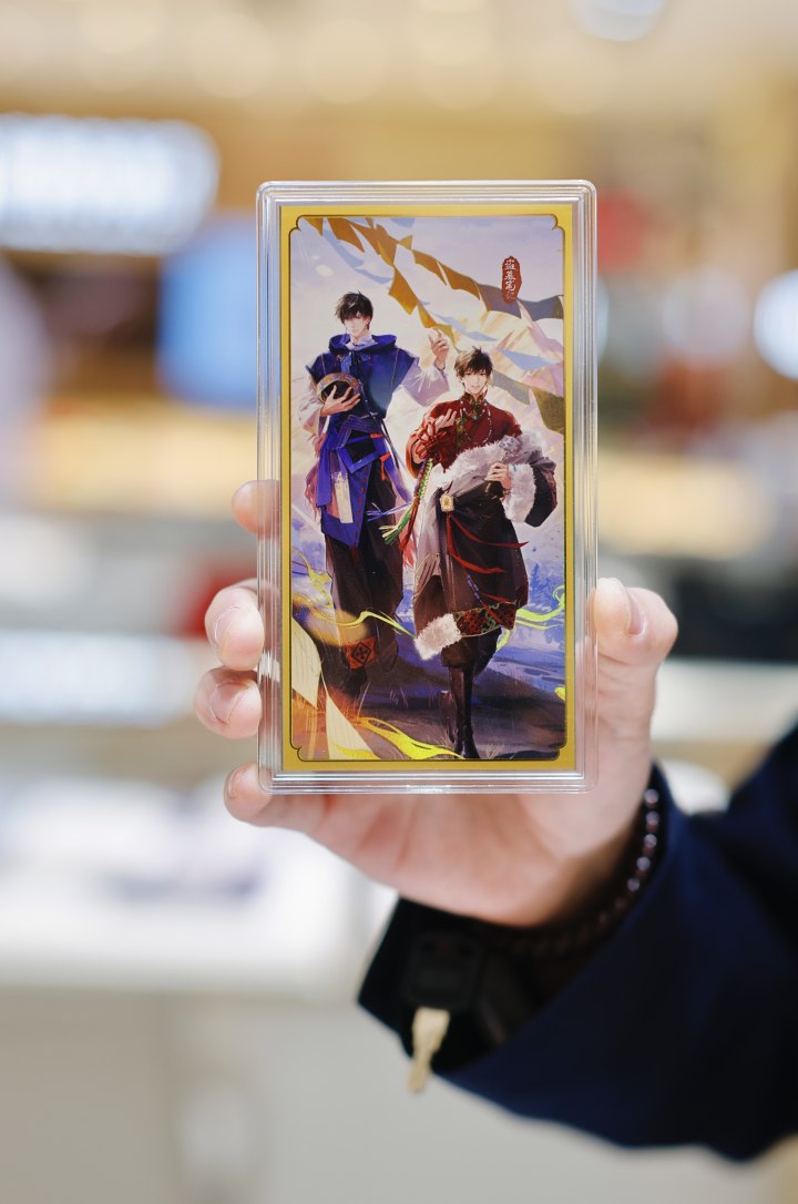 曼卡龙也有二次元“痛金”:联合超级IP《盗墓笔记》推出的联名系列。联名是去年7月推出的,当时系列里多个单品就卖疯了,尤其是印有主要角色人物的1克金钞。今年1月,这个系列又推出新春版,新版的1克金钞上印的是张起灵和吴邪CP组合,还搭配同款礼盒,礼盒里还有《盗墓笔记》其他周边,包括春联、红包和人物立牌、卡片等。