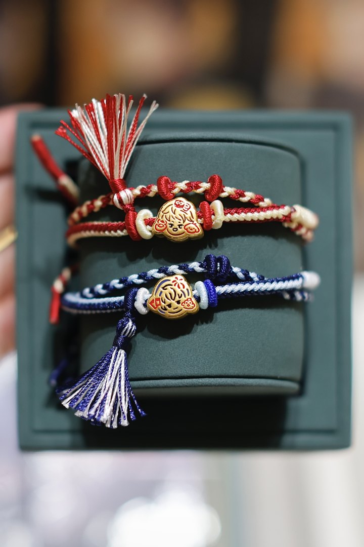 明年农历新年是马年,“马上有钱”、“马到成功”,这些带着属相的吉祥寓意,也在黄金圈里火了一把,各种与马相关的谐音梗也颇受消费者喜欢。在武林银泰百货A座2楼的老凤祥柜台,柜姐们的肩膀上人手一匹红色幸运小马,新春氛围感拉满。正忙着给客人编手绳的导购小陈告诉记者,各种小马造型的转运珠从去年9、10月份上架开始,就一直是热销款,其中有些甚至已经断货,“一颗克重大约1克,我们提供免费编绳。前几天人多的时候,我和同事们根本来不及编。”