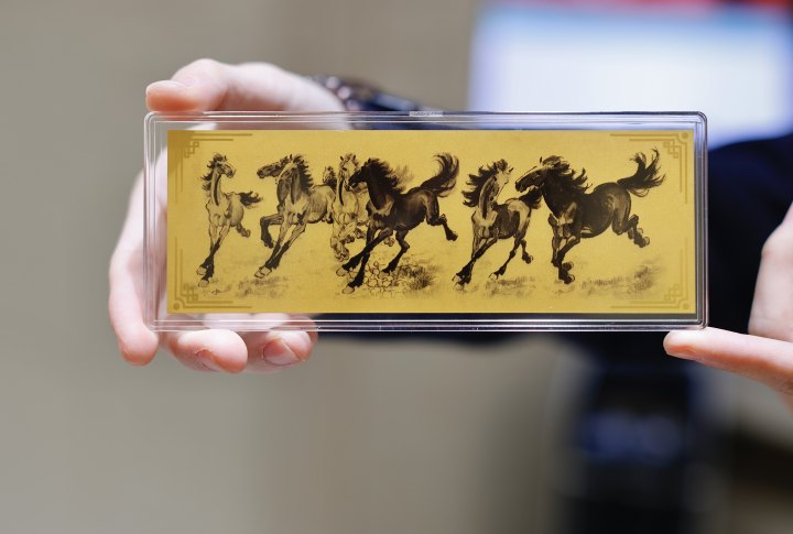 但要说新鲜且应景的联名,曼卡龙今年主打的是徐悲鸿美术馆系列,包括手链、吊坠、戒指等款式。其中也有1克的金钞版,正面印有徐悲鸿笔下的万马奔腾,背面印的则是他写的“天马行空”。品牌也很用心,每一枚金钞都配有红色礼盒,里面包括春联、红包以及一枚0.01克的金贴。“上周有个顾客看到我们的品牌广告,就特地赶到武林银泰百货来,在我这里一口气买走了9套,说是作为员工福利,有价值又有意义。”小徐说。