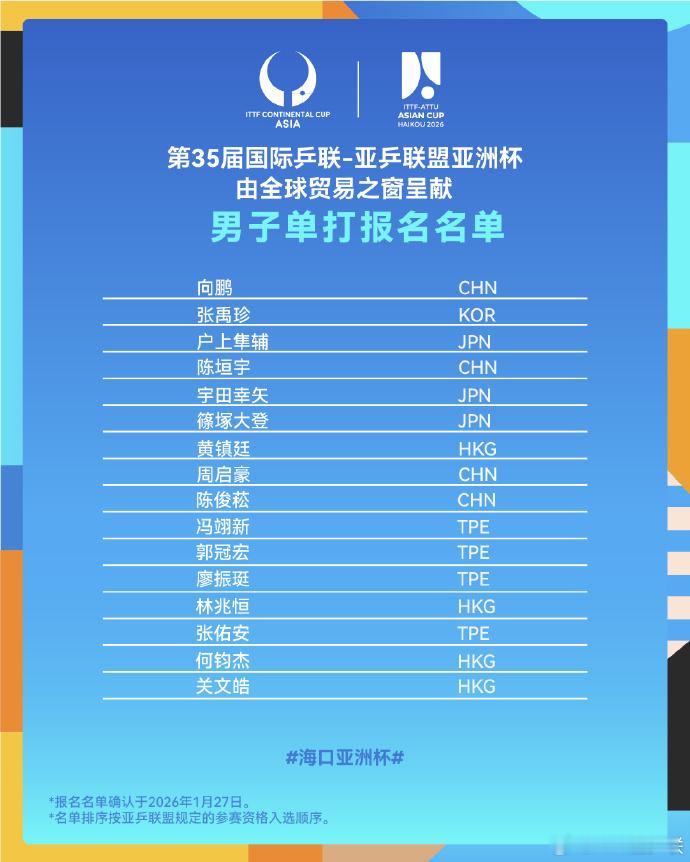 2026 ITTF-ATTU海口亚洲杯参赛人员名单更新中国队梁靖崑退赛,陈俊菘递