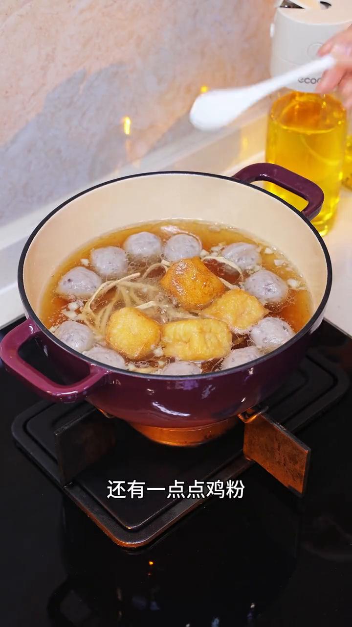 花个几分钟就能搞定的牛肉丸粉丝汤,自己在家做味道一点也不输外面的。天冷了就这么煮,热乎又好吃。今天煮的是两人份的。 ·先来把蒜末炒香,炒蒜末的时候火不要太大,很容易焦断。 ·生了之后加上几颗牛肉丸一起炒一炒,牛肉丸炒一下吃起来会更香。 ·加上开水,煮开了之后再放上泡软的红薯粉、豆腐皮、油豆腐这些。 ·调味就加上生抽、盐、胡椒粉,还有一点点鸡粉。食材就是家里有什么放什么,牛百叶不用煮久的,焯个十几秒就行。 ·最后再来一点辣椒油跟香菜就可以关火。 这一锅牛肉丸粉丝汤加上辣椒油吃起来是香而不辣。天冷了就适合嗦粉,热乎乎的吃完特别舒服。像上班族的朋友下班回到家就只需要花个10分钟就能吃上一锅热乎乎的汤粉,喜欢的朋友赶紧去试一下。 我是小坏,喜欢我的视频请您点赞收藏。点赞关注收藏。