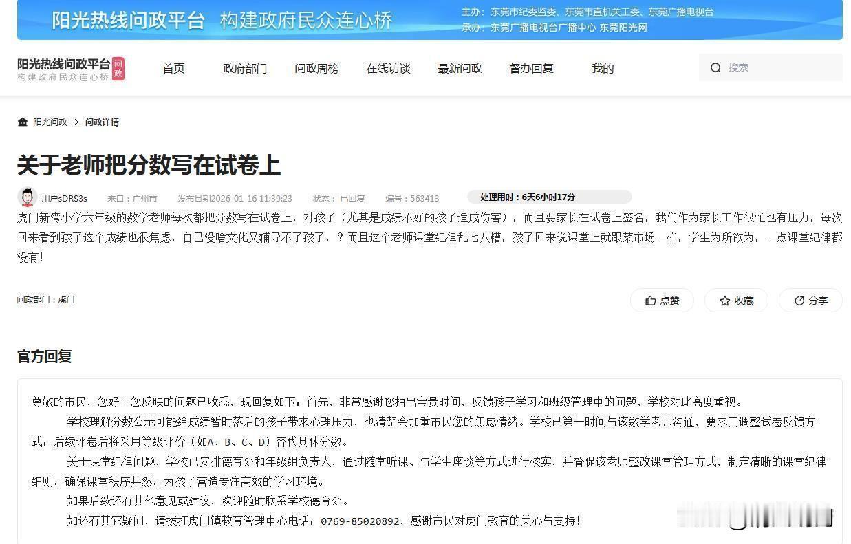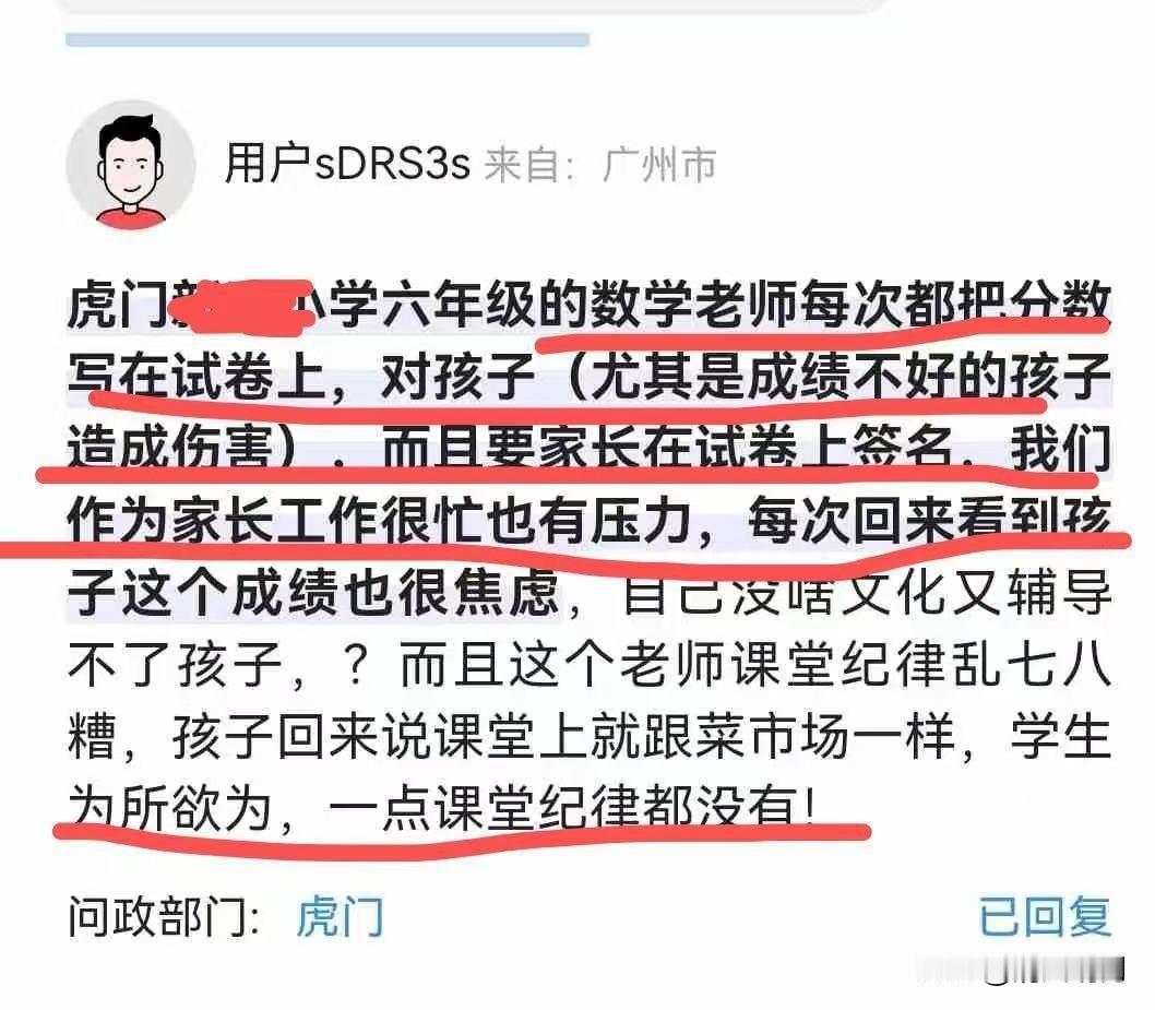 广东东莞!一位6年级家长投诉数学老师,每次把分数都写在试卷上,对孩子造成伤害。相关部门马上反馈,立即改正。 关于一位六年级家长投诉数学老师的问题,反映出老师在批改试卷时习惯性地将分数写在试卷上,可能对孩子的心理造成了一定的影响。 对此,相关部门高度重视,迅速进行了反馈并要求老师立即改正。 教育的核心是关爱和引导,老师在批改试卷时应注重鼓励与引导,而非单纯强调分数,以免对学生的自信心和学习积极性产生负面影响。 此次事件的处理体现了教育部门对学生心理健康的重视,也提醒教师在教学过程中要更加细心、负责。 希望未来老师们在评价学生时,既要客观公正,也要注重方式方法,营造一个积极、健康的学习环境,让孩子们在成长中既能学习知识,也能培养良好的心态。