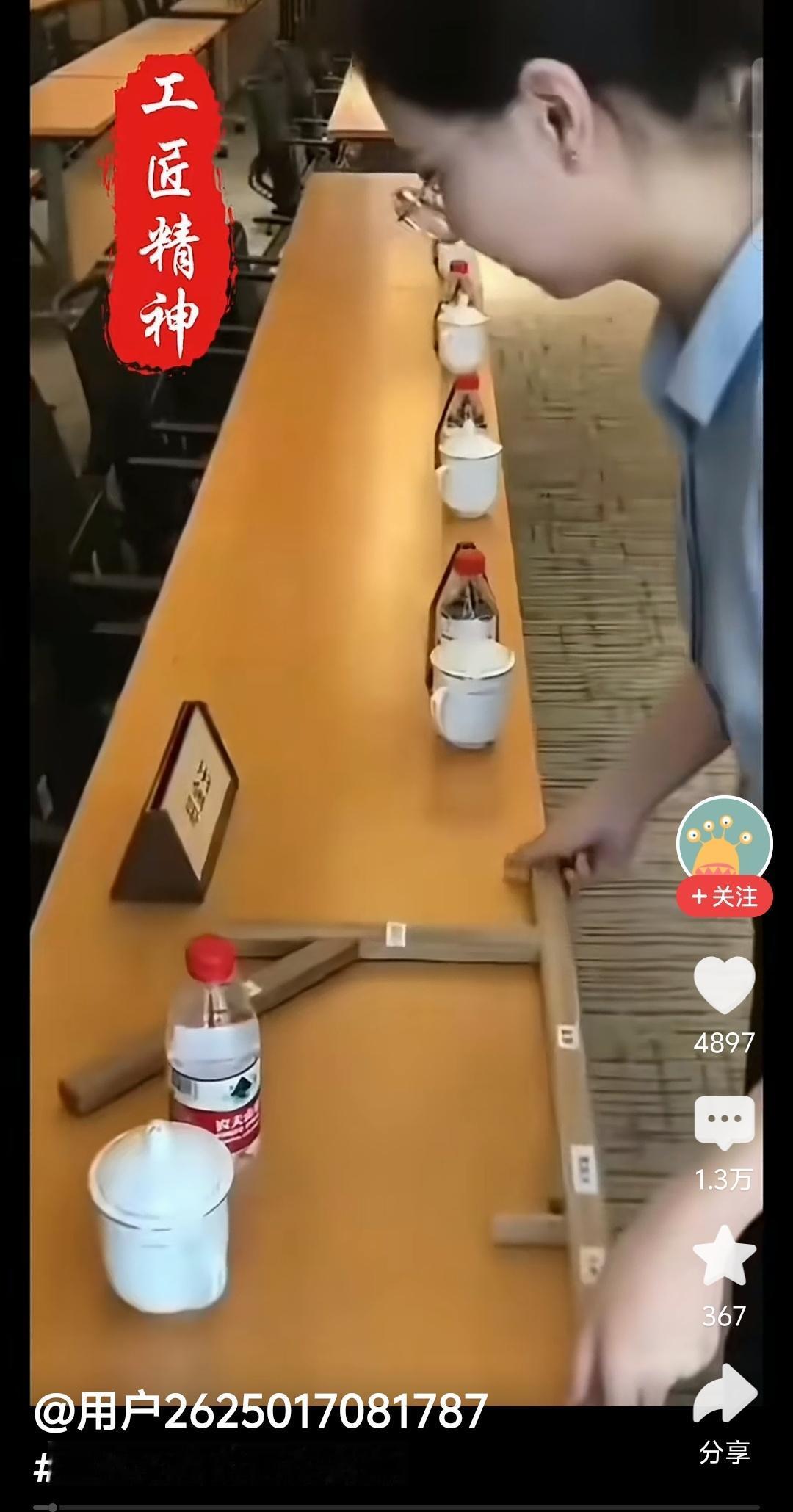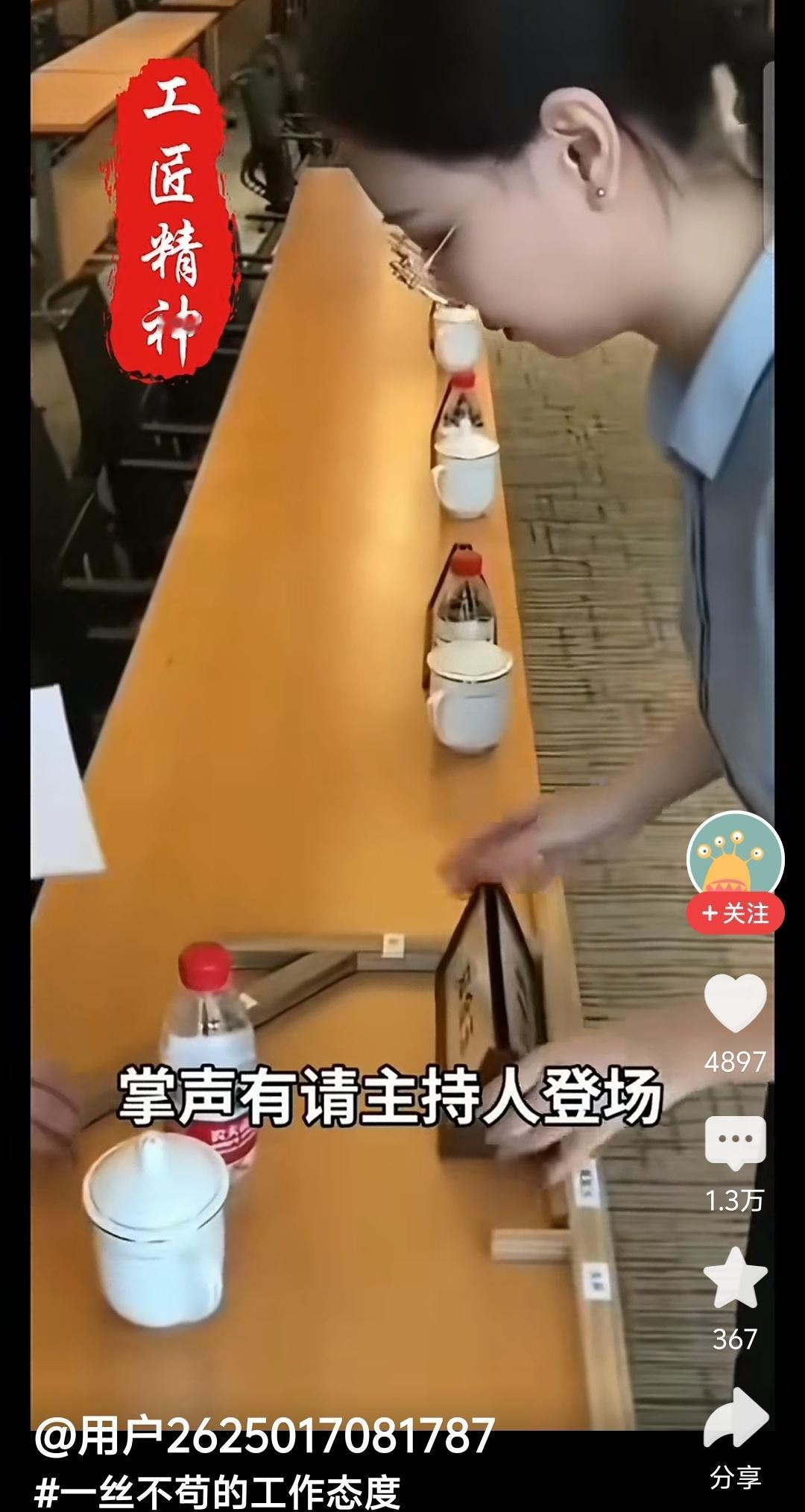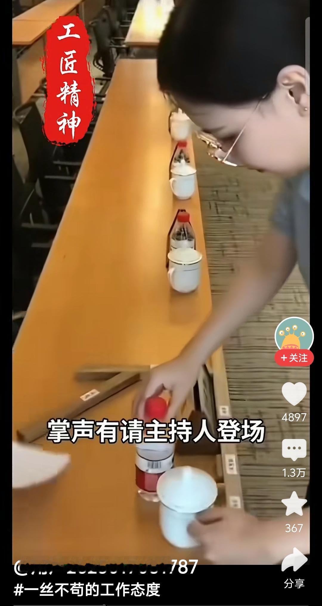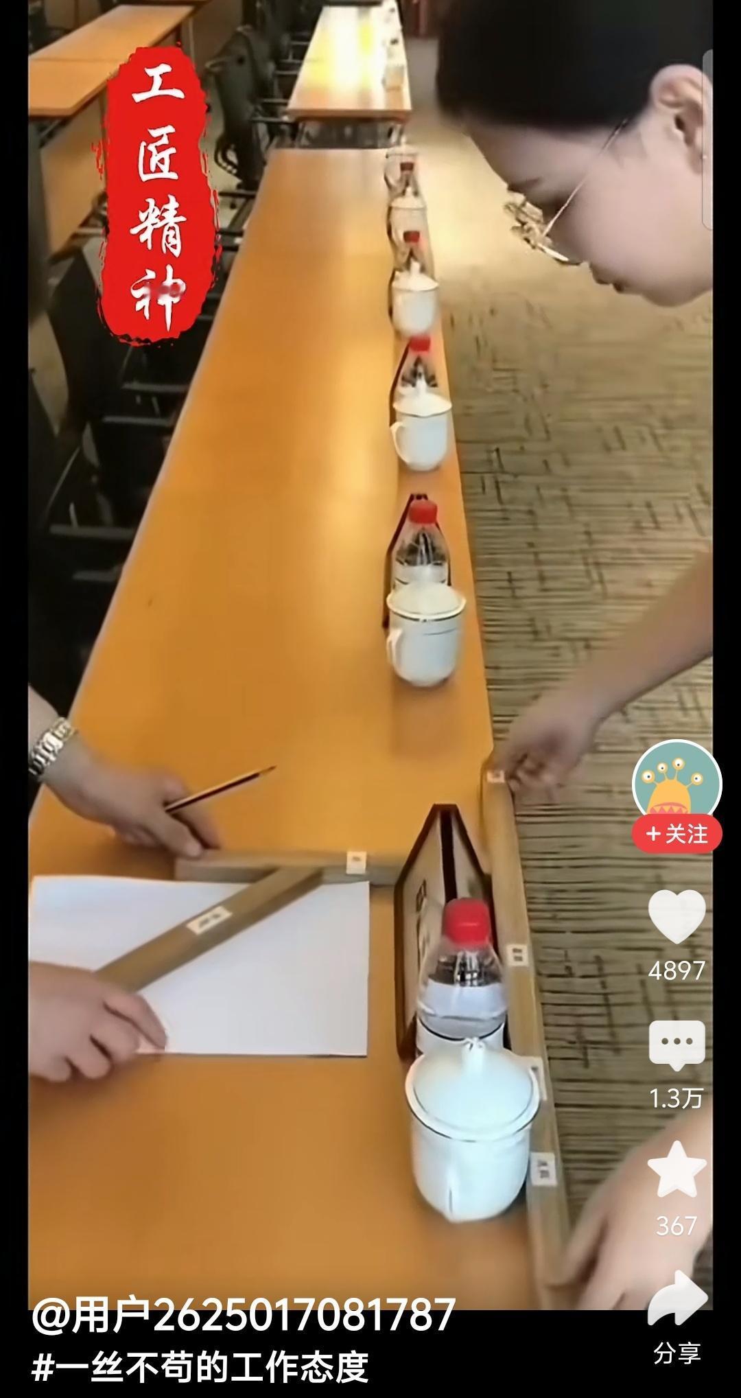 如果你想说啥,请闭上你的嘴,这些小姑娘的劳动本身是值得尊重的,她们不这样干饭碗就没饭没菜了。拿着尺子摆水杯、矿泉水瓶、文件,体现的也是精益求精的工匠精神。