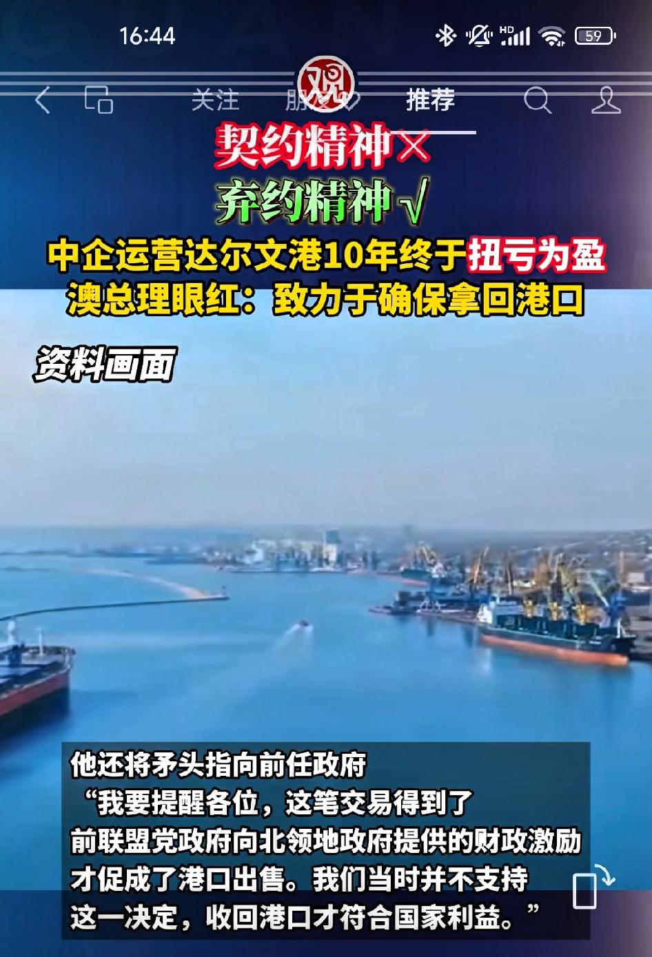 中企运营达尔文港10年扭亏为盈,澳总理眼红要收回港口! 澳总理声称:政府已经明确表态,希望收回这座出售给非澳大利亚利益方运营的港口。 尽管此前澳方多轮审查均表明,将达尔文港出售给中企,并不存在所谓“国家安全风险”,但阿尔巴尼斯仍宣称:这笔交易不符合澳大利亚国家利益。 中国驻澳大使直指澳方这个行为的不合理:在港口亏损时租出去,在港口盈利时把它收回来,这在道义上是欠妥的。 编者按:澳大利亚毫无契约精神,动辄以危害国家安全当做借口,殊不知安理会四大常任理事国接连访问中国,大家都知道看向东方的重要性,澳方仍在后知后觉。