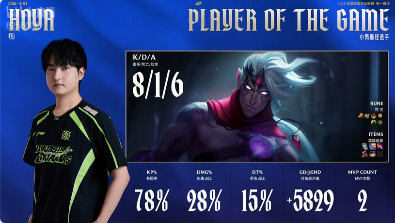 Hoya韦鲁斯打出8/1/6战绩,拿到NIP对阵TT首局比赛MVP