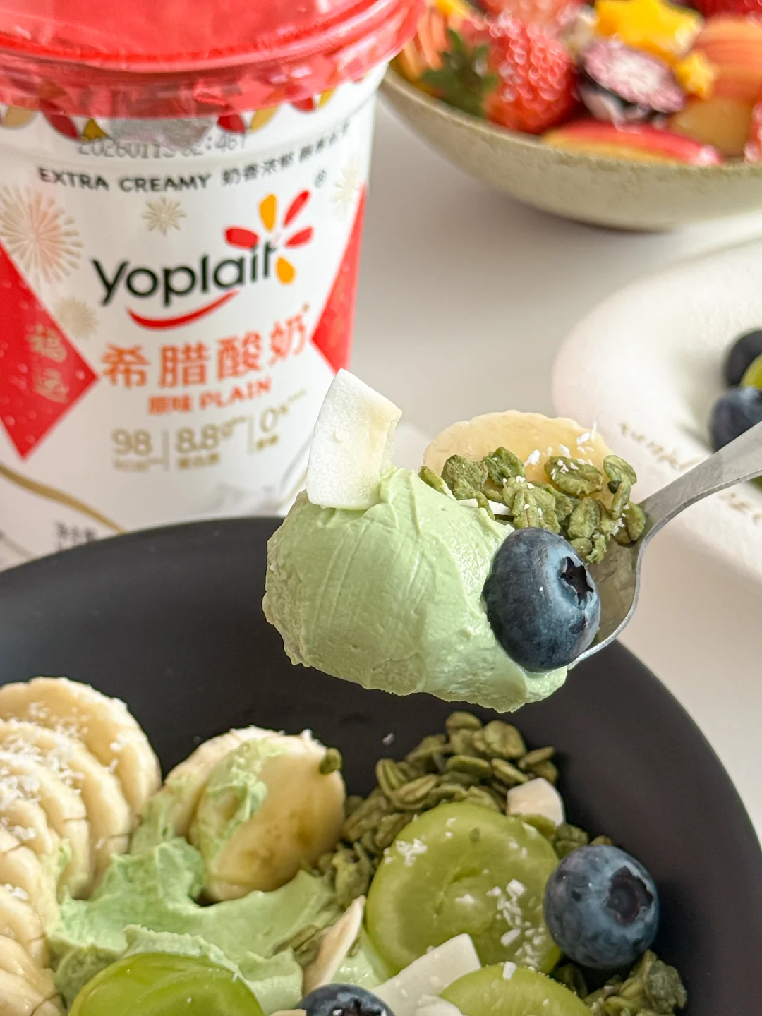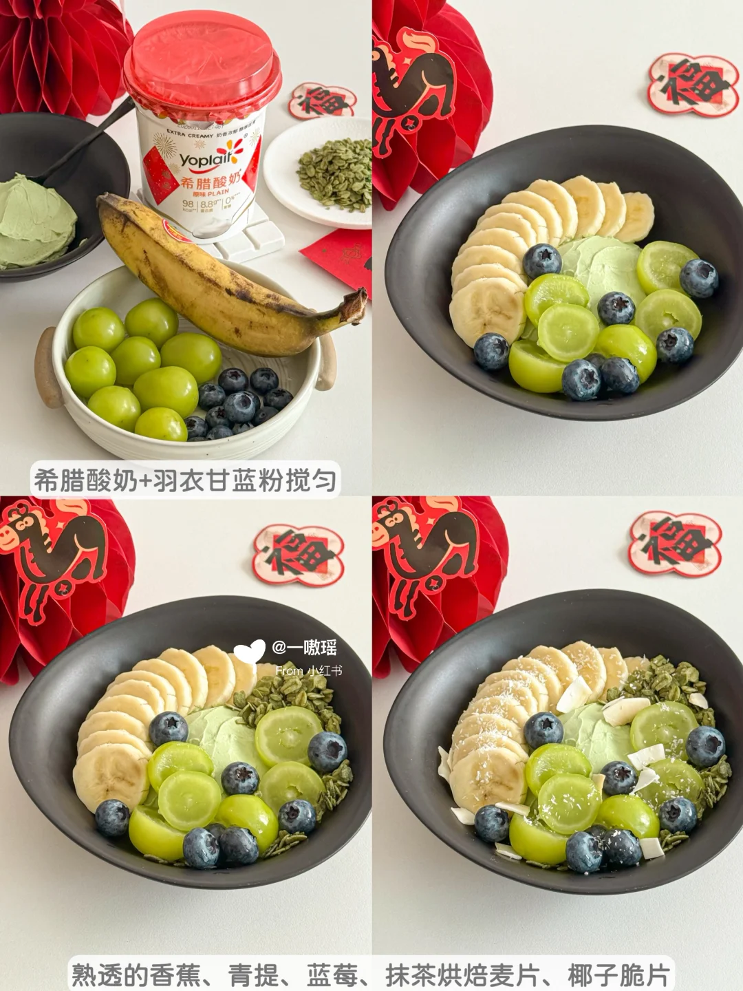 希腊酸奶(+羽衣甘蓝粉)+香蕉、青提、蓝莓+抹茶麦片+椰蓉/椰子脆片