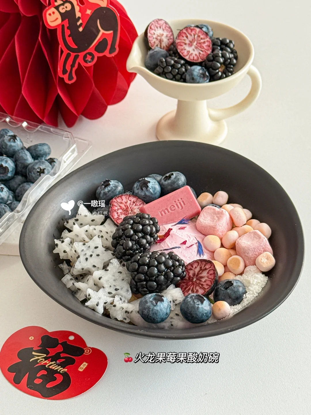 希腊酸奶(+树莓粉、甜菜根粉)+白心火龙果、蓝莓、黑莓+果蔬小馒头+巧克力+椰蓉