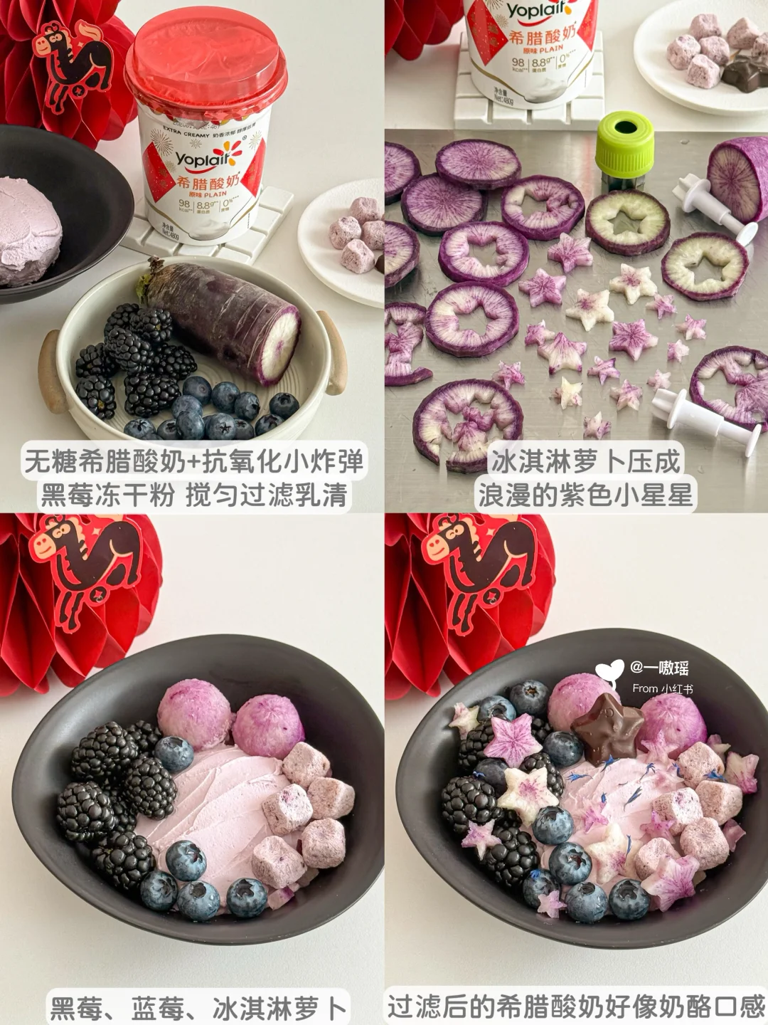 希腊酸奶(+黑莓冻干粉)+蓝莓、黑莓、冰淇淋水果萝卜+黑巧