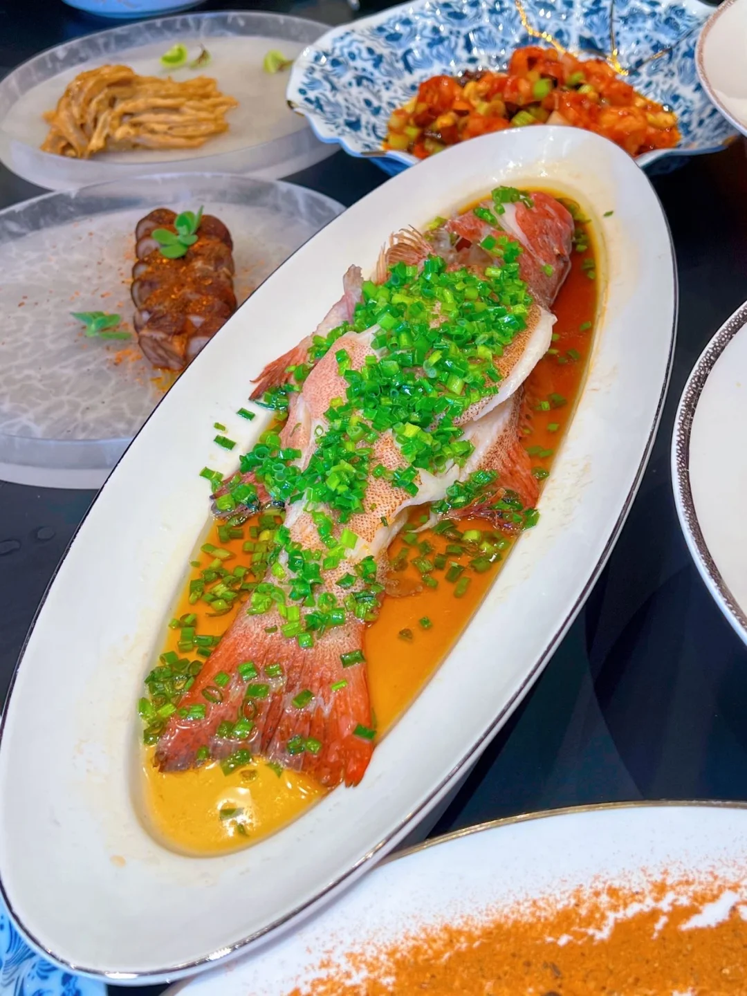 香葱碧绿蒸东星斑,东星斑本身的肉质就软嫩到极致,清蒸做法完美锁鲜,入口滑溜溜的带着淡淡的葱香,鲜而不腥,连不爱吃鱼的客户都忍不住多夹了几口~