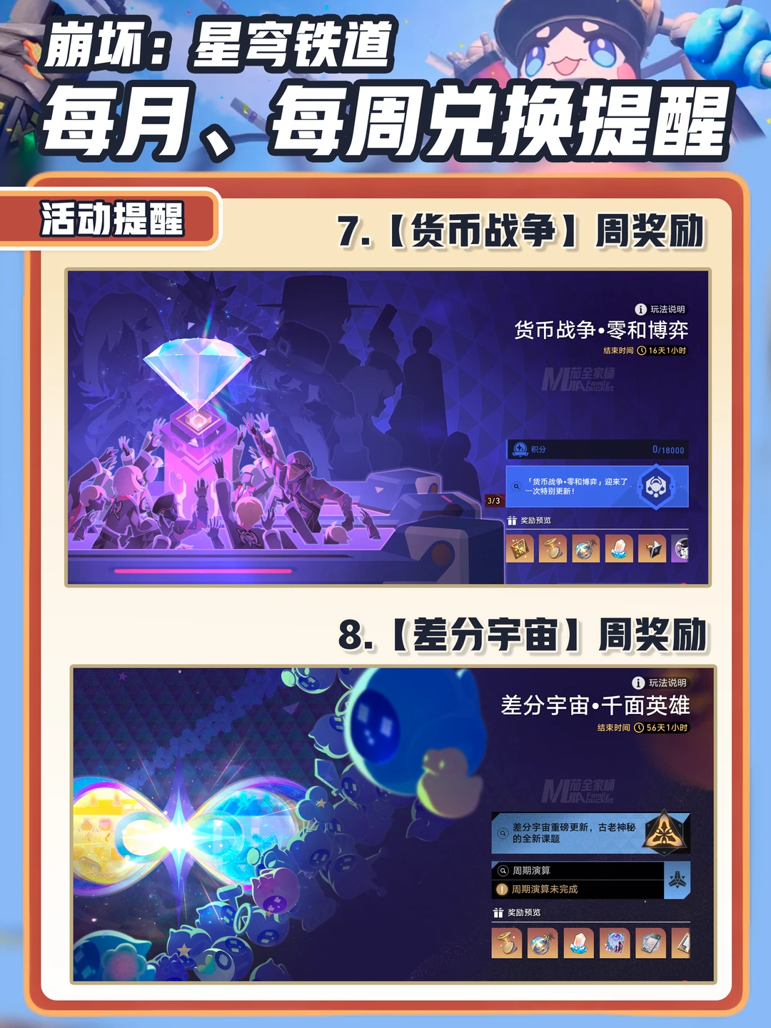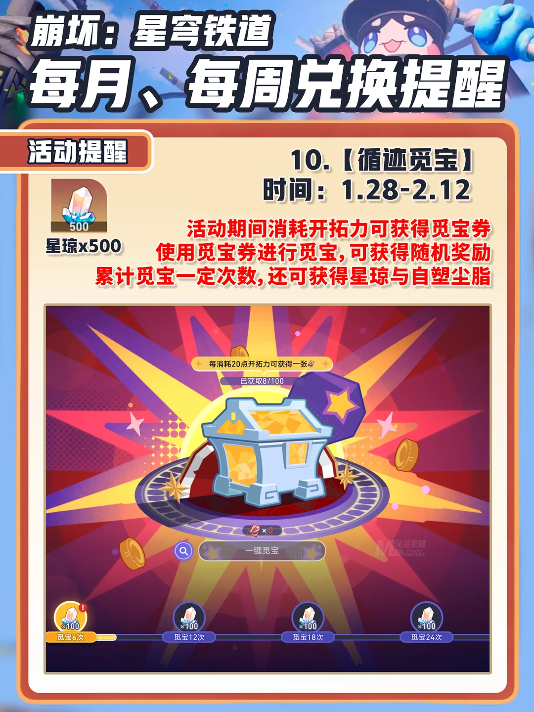 崩坏星穹铁道|每月每周必拿活动资源攻略 1.新增活动【花藏繁生】双倍材料 2.新增活动【循迹觅宝】可以获得500星琼,记得上线完成~ 注:自塑尘脂和每月10抽这两个不要忘哦~以及「货币战争」&「模拟宇宙」为双周奖励,记得打哦~ 另:4.0版本期间,可以1:1兑换一定数量的【欢愉】命途材料。