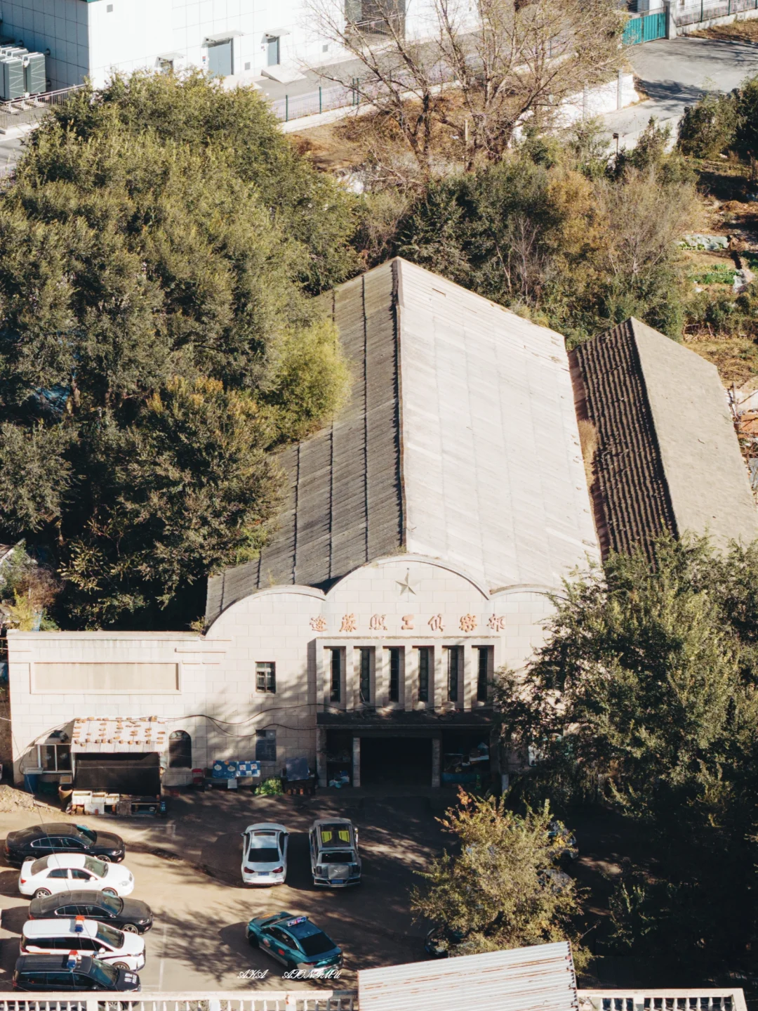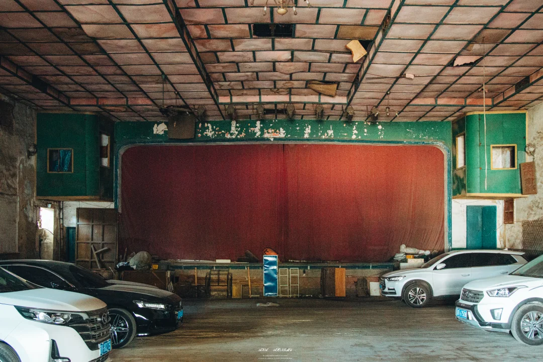 这个俱乐部可太有感觉了啊,光看这个门头就能想象它以前的气势,这座1956年建的职工俱乐部,占地600多平米,现在里面的座椅都拆了,不过舞台上的红幕布、木质地板还留着,现在它成了派出所的车库,也算继续发挥余热