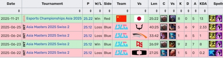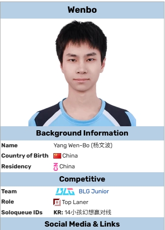 根据数据网站记录Wenbo真名为杨文波,与JKL同名但不同姓,于2025年5月才加盟BLG的二队开启职业生涯,并且并不是BLG二队的首发上单,只在之前的亚洲之星国际赛、亚洲电竞冠军赛中有过登场。