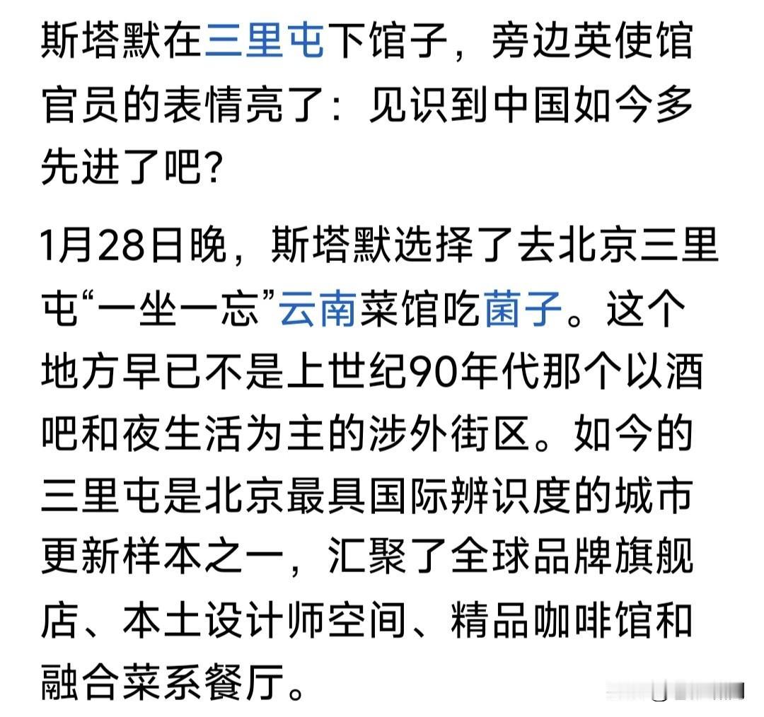 想不到斯塔默这样的呆板政客,也有随和亲民一面!更想不到中国年轻人,对他如此好感,拥簇表达欢迎。 斯塔默来华访问,晚上在北京小巷“云南菜馆”吃晚饭,不想被一些年轻人发现,蜂拥而上进行友好交流。 网友介绍说,前年美国前任财长耶伦访华,也在这家餐馆吃饭,可见该餐馆有特色,斯塔默是否听她建议? 记得耶伦在这此吃饭,数位中国名媛作陪。有人说她们有“奸细”嫌疑,要求国家查其底细,闹成国际笑话! 本人觉得不管谁来访问,都是中国的尊贵客人,我们都要热情相待! 尤其贵为美国财长英国首相,能来这种菜馆用餐,更显随和亲民本色。何况能来作陪,必经有关部门同意,有什么值得怀疑的呢?太小家子气吧? 苍狼有点不明白:当下世界大趋势,政经科文大融合,互相交流取长补短,互促发展合作共赢!有些国人还是“斗争”思维,如何互相融入发展呢? …………