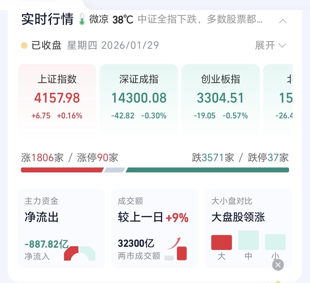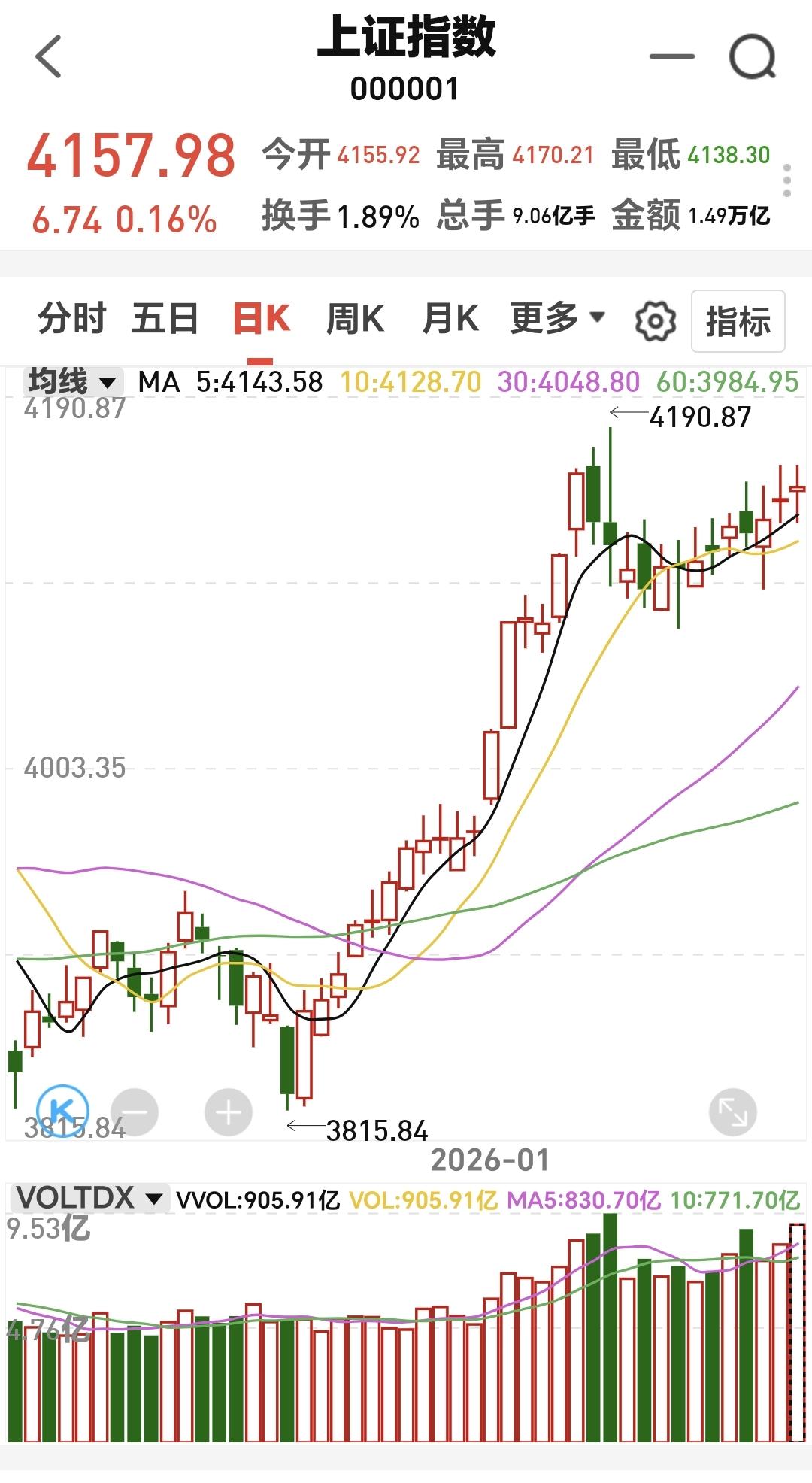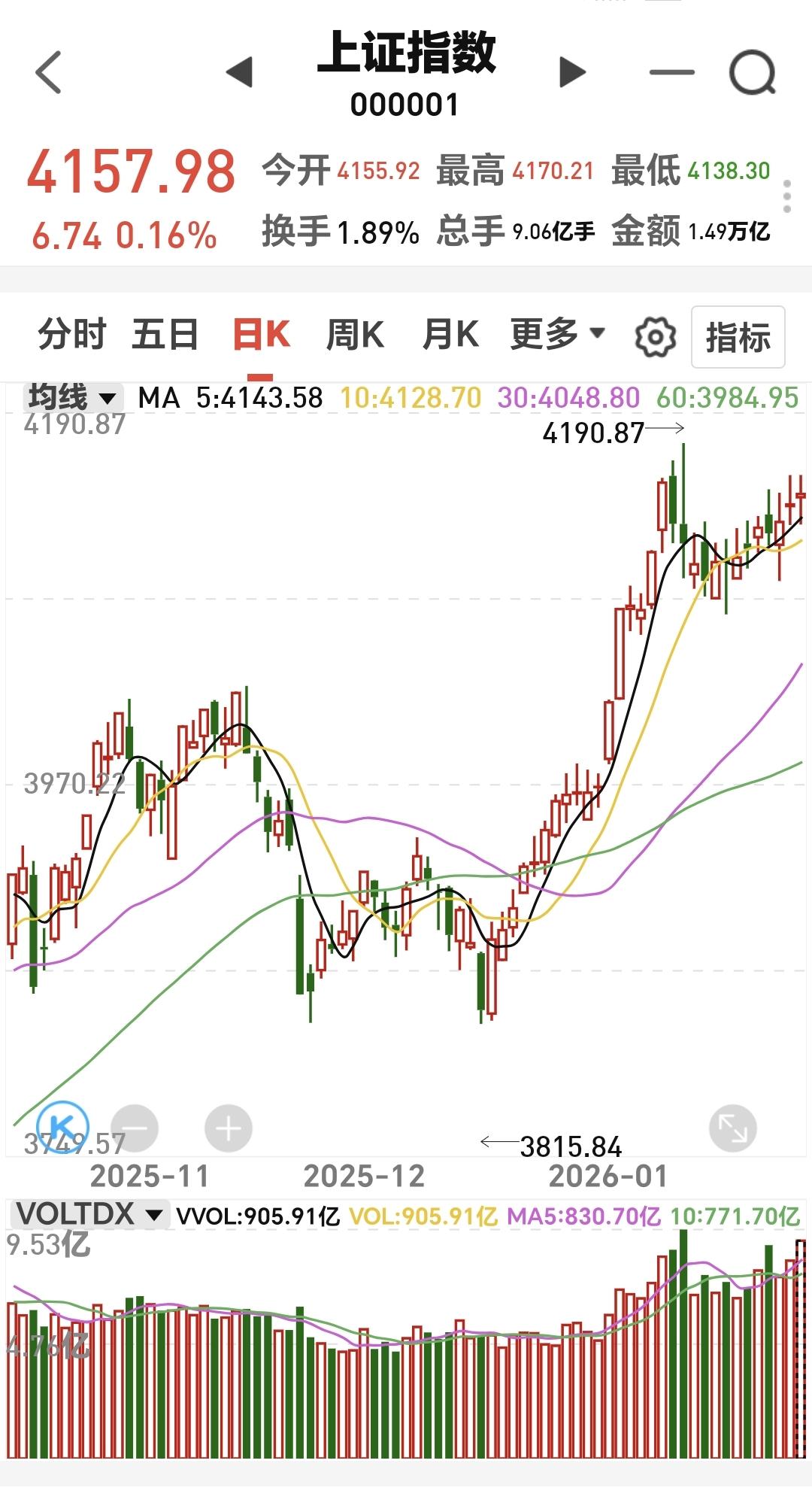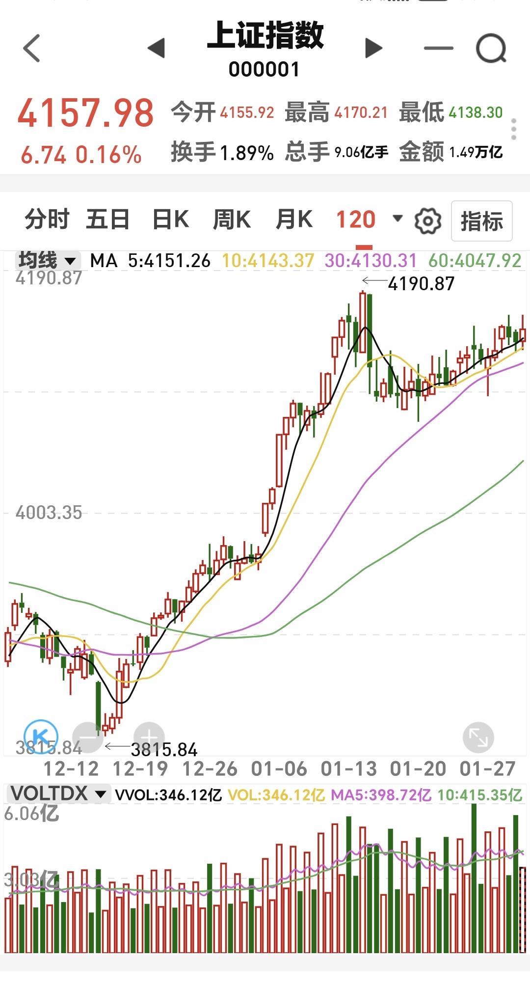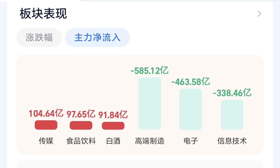 基金:再一次止盈的前提条件 今天市场全天小幅度震荡,收盘的时候指数涨跌不一,创业板指下跌了0.57%,收于3304点,上证指数上涨了0.16%,收于4157点。 整个股票市场,上涨1806家,下跌3571家,涨停90家,跌停37家,上涨家数少于下跌家数。 今天两市累计成交32300亿,相比于昨天放量了9%,主力资金净流出887亿。 持有的基金中,下午收盘的时候,估值上涨幅度最大的三个板块是:白酒板块,大消费板块,上证50板块,估值下跌幅度最大的三个板块是:芯片半导体板块,军工板块,5G板块,估值整体亏损了276元。 整个基金市场,上涨11319家,下跌8204家,上涨幅度超过5%的92家,下跌幅度超过5%的7家。 图9是今天基金的上涨排行榜,图10是今天基金的下跌排行榜,图11是ETF上涨幅度排行榜,图12是今天基金的加仓榜,图13是今天基金的减仓榜。 1:今天黄色线上窜下跳,上午黄色线在上,蓝色线在下,下午是黄色线在下,蓝色线在上,这也是今天没有能够持续上涨的原因。 2:今天成交量放大9%,市场整体是高位震荡,资金有出逃的嫌疑,主力资金最近都是持续净流出,而且净流出的金额不小。 3:收盘的时候五天线位置是4143点,收盘点位4157点,收在五天线之上,只要能够收在五天线之上,就不要主观地认为市场已经走坏。 4:看下面的截图14,这是主力资金进出板块的情况,主力资金净流入最多的三个板块是:传媒板块,食品饮料板块,白酒板块,主力资金净流出最多的三个板块是:高端制造板块,电子板块,信息技术板块,今天主力资金净流入食品饮料和白酒板块都超过了90亿以上,这也引发了今天白酒板块的大涨,但今天的大涨并不能确定这个板块已经反转,需要观察有没有资金持续净流入,我们只要坚持定投就可以了,连续下跌超过五年的板块,不可能在一夜之间反转直接向上的。 5:看下面的截图15,这是上证指数日K线图,你看一下3815点到4190点期间的上涨速度,再看看最近一段时间的上涨速度,是不是上涨速度明显下降了,如果以现在这样的速度继续上涨到前高4190点附近,那里可能会形成一个相对大一点级别的高点,当然,4190点绝不可能是2026年的最高点,今年还会再创新高,而且会在4190点上方很远的地方,这也是我说最近有可能进行这一次止盈的主要原因。 6:看下面的截图16,这是白酒板块日K线图,今天的上涨突破了下跌通道上轨线,是不是有效突破还需要确认,需要观察后面的走势,许多人在问,今天可不可以进场白酒板块,我只能告诉你的是,日线级别短线下跌趋势被改变的可能性很大,但这只是概率的问题,并不是100%已经改变了下跌趋势,何况周线级别和月线级别还是下跌趋势中。 我喜欢潜伏,我不喜欢追高,这是很多人知道的,我喜欢平平淡淡,我不喜欢大起大落,像白酒板块今天的大涨,并没有让我兴奋,我的心态很平静,低位区域横盘震荡的时间越长,对我们定投的人来说是越友好,可以让我们捞到更多便宜的筹码,不要想着在某一个板块当中挣大钱,均衡配置才是更重要的。 大家帮忙评论,点赞,转发和分享,谢谢大家的支持。