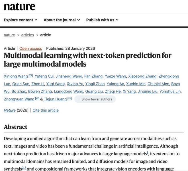 1月28日,智源研究院多模态大模型成果"Multimodallearningwithnext-tokenpredictionforlargemultimodalmodels(通过预测下一个词元进行多模态学习的多模态大模型)",在学术期刊《自然》(Nature)上线。据了解,这是我国科研机构主导的大模型成果首次在Nature正刊发表。