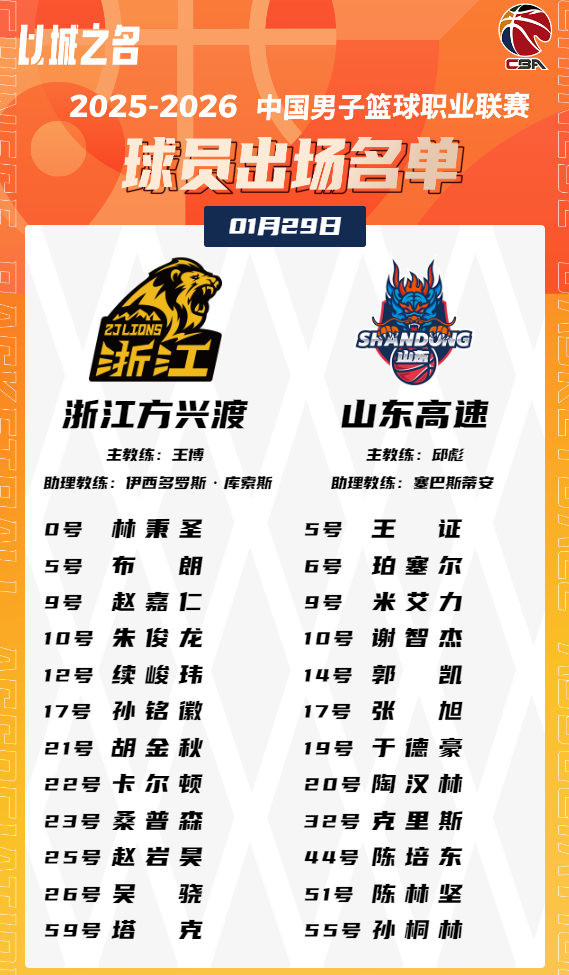 虎扑01月29日讯今日CBA常规赛,广厦对阵山东的大名单已经公布。