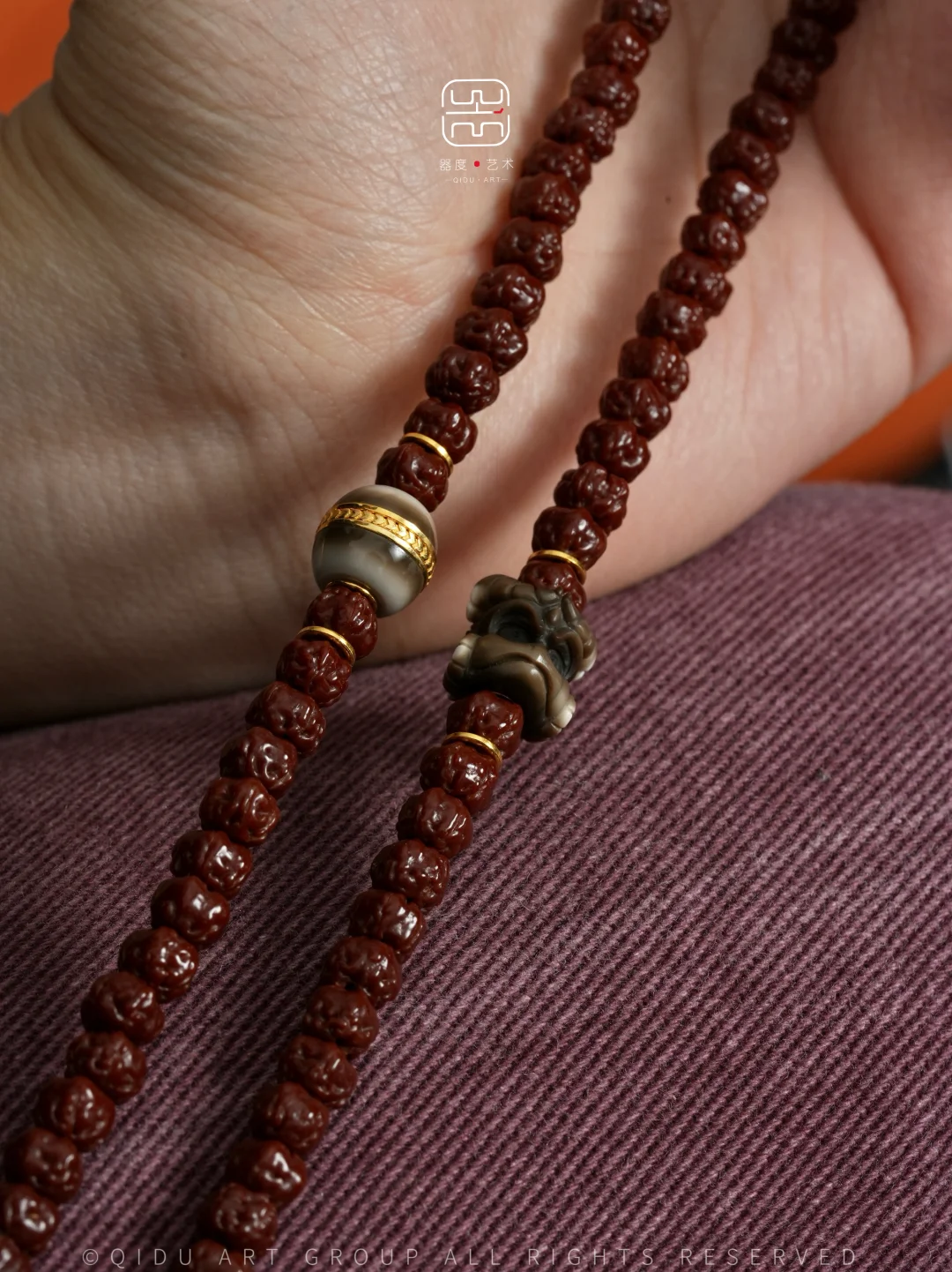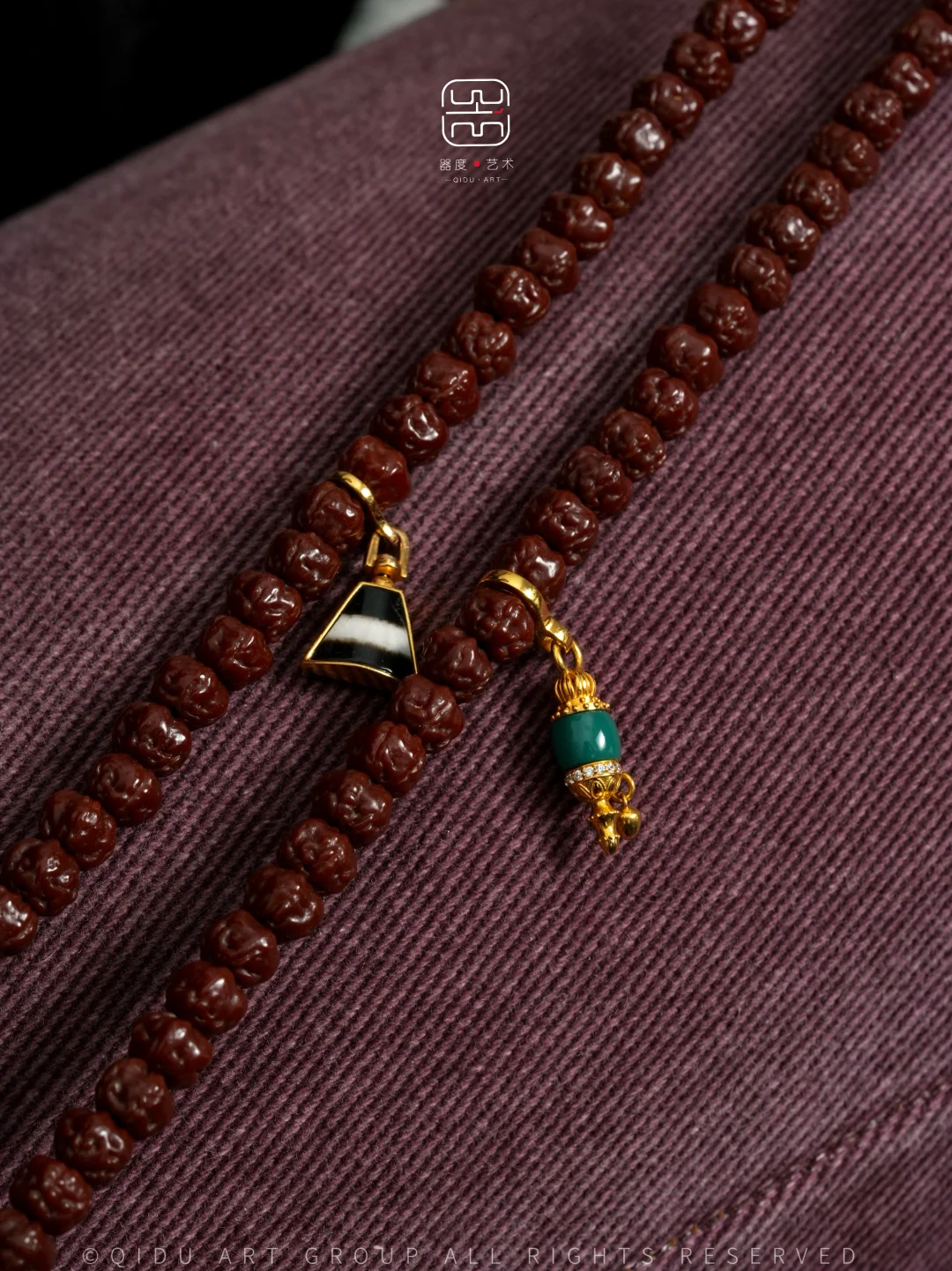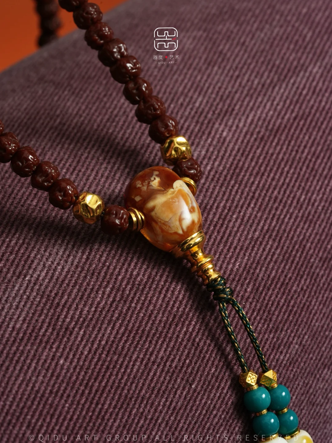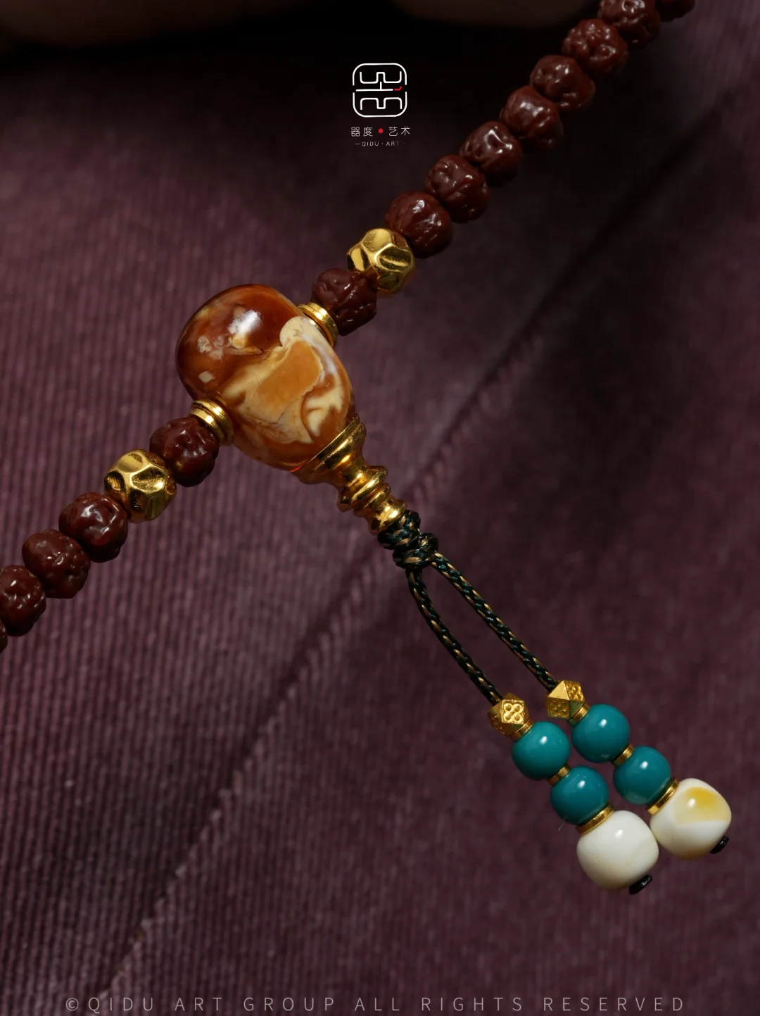 一年两年,盘红了总需要耐心。 搭配也是。 金管精工大鹏鸟 上肯天珠汉堡 绿松石18k转经筒 云盖寺弟子珠 超妖超沁红皮蜜蜡三通... 这是一套客定,原来是要自留的一套搭配,有幸被喜欢的人所喜欢,最终版做了一些调整就是今天的样子..