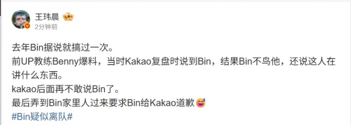 直播吧1月29日讯今日网上有爆料称Bin和BLG管理层矛盾,已经离开基地。体坛周报记者吃瓜这一事件,并且引用了此前的一篇报道,前UP教练爆料称Bin已经不是第一次和管理层冲突了。