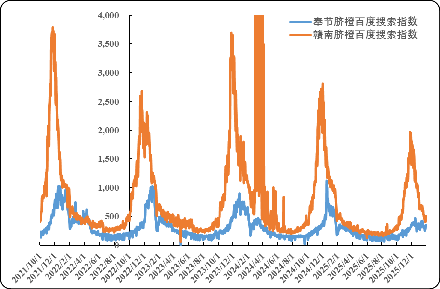 通常情况下,元旦后国内脐橙百度搜索指数会出现短暂回升且于春节前窄幅震荡运行。然而,今年全国脐橙百度搜索指数却是再次进入快速下滑阶段。具体来看,1月下旬以来奉节脐橙百度搜索指数累计下滑11.33%,赣南脐橙百度搜索指数累计下滑19.83%。新华指数研究院农业市场研究中心研判,叠加三峡库区出货规模稳步提升,春节前国内鲜橙产销两地批发价或将难以止跌企稳。