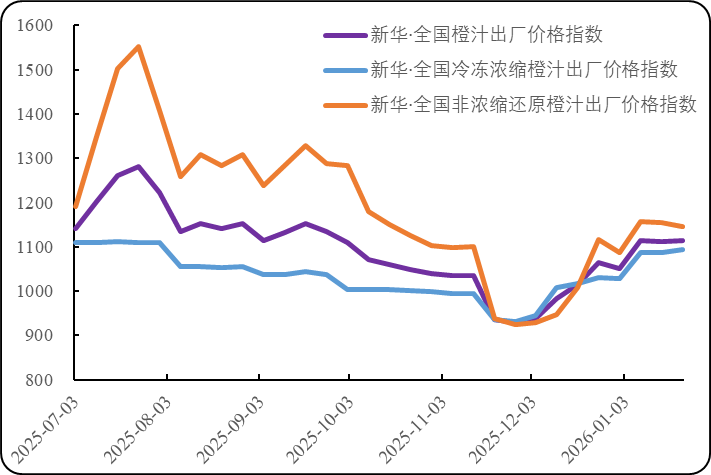 新华财经北京1月29日电(张保贺)欧盟鲜食甜橙减产且价格高企或将使得低价的橙汁消费增量,叠加中国传统春节假期临近带动终端市场鲜橙及橙汁消费增量,综合使得近期全球橙汁市场价震荡回升。期间,国内橙汁加工规模提升,加工橙收购价震荡上涨,使得宽幅波动的非浓缩还原橙汁出厂价率先上涨。截至1月29日,当周全球冷冻浓缩橙汁期货合约(FCOJ2603)结算均价为215.78美分/磅(折合33.19元人民币/公斤),环比(1月22日,下同)上涨6.24%;新华·全国冷冻浓缩橙汁出厂价格指数报1093.09点,环比下跌0.06%;新华·全国非浓缩还原橙汁出厂价格指数报1147.61点,环比上涨0.14%;新华·全国橙汁出厂价格指数报1114.00点,环比仅上浮0.02%。