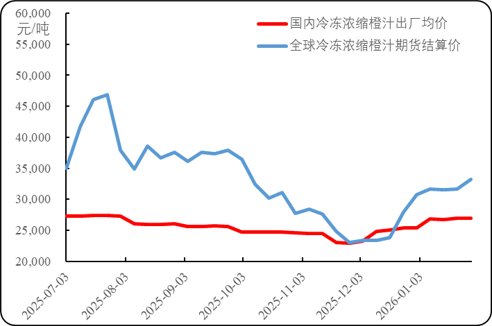 备注:基于价格数据反映出市场规律,指数基期调整为2025年12月,基点1000点;结合美国农业部外国农业服务局(USDA-FAS)报告中我国冷冻浓缩橙汁产量数据、国内行业机构测算的非浓缩还原橙汁产量数据,以14:3的比重统一折算为所需加工果数量,权重固定为61.65%:38.35%。