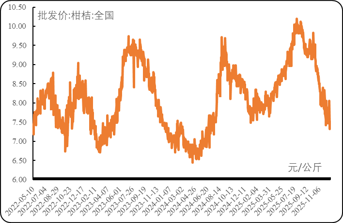 国内柑橘产量稳步提升,叠加不易扒皮的甜橙鲜果消费缩量,还有销售比重向电商平台倾斜导致产地出货承压,导致全国脐橙乃至柑橘销地批发价持续下滑,仅有少数的特色杂柑品类批发价出现上涨。截至1月29日,当周全国柑桔销地批发均价为6.50元/公斤,环比下跌3.97%;其中,脐橙均价为7.31元/公斤,环比下跌7.32%;沃柑均价为6.62元/公斤,环比下跌5.99%;默科特均价为6.53元/公斤,环比上浮0.38%;春见桔橙均价为8.18元/公斤,环比上涨7.63%。