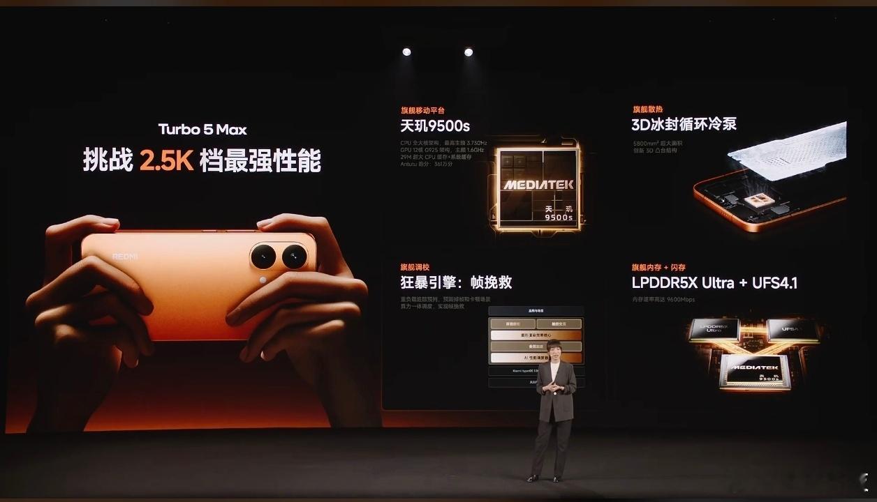 红米Turbo5发布会 这次发布的红米Turbo5 Max,配置很顶啊!!天玑9500s、游戏帧率稳、9000mAh大电池、100W超级快充、27W无线充电!!