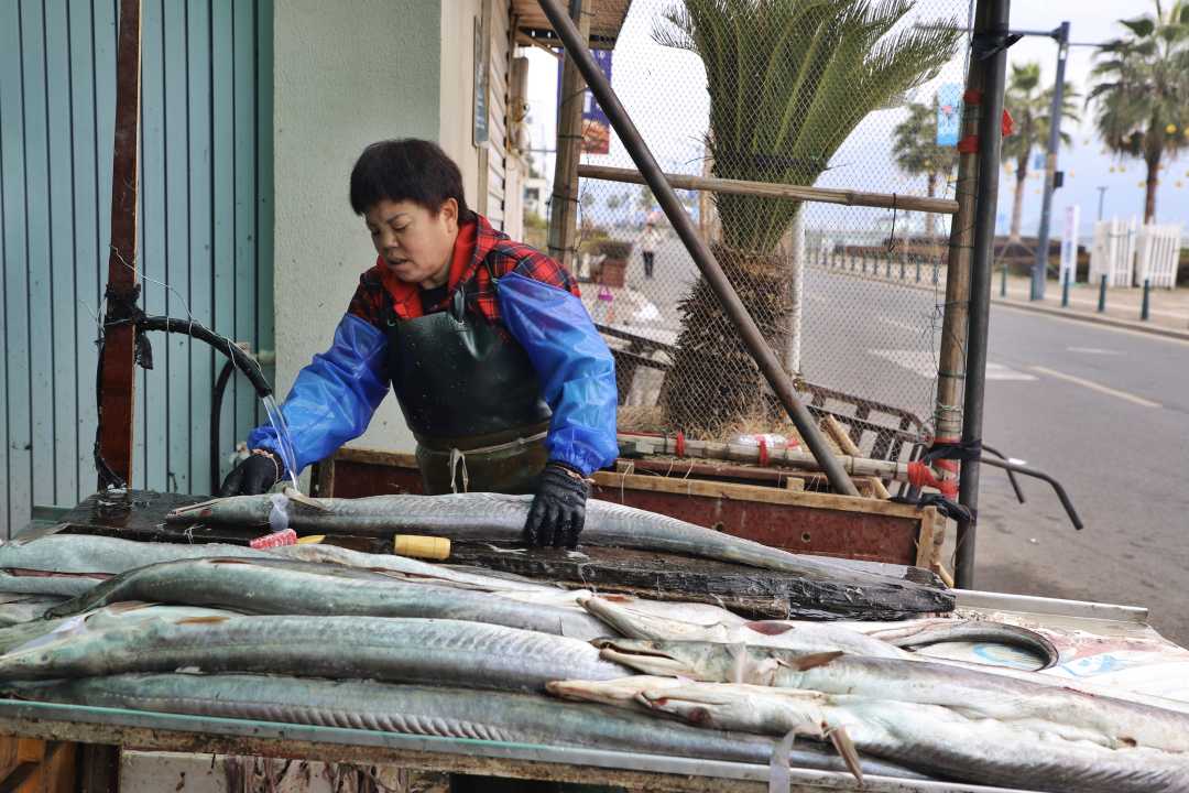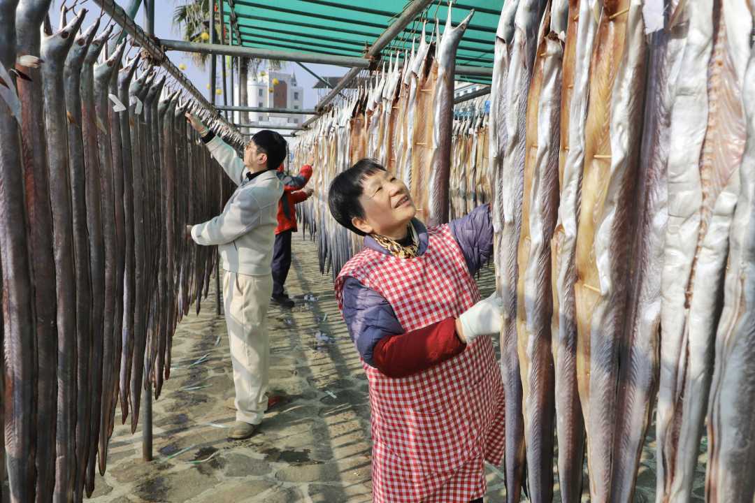 尤思恩夫妇守着做风鳗的手艺已30多年,聊起这门祖传的渔家绝活,两人如数家珍:“老渔民传下的规矩讲究着呢,风鳗非得等腊月天晾晒不可,这样做出来的才最地道、最鲜香。”说话间,一位路过的游客拿起一条风鳗掂量着称赞:“今天在餐馆刚尝过,鲜味儿太足了!现在知道是这么讲究的工艺做出来的,特意过来多买几条,捎给老家的亲戚朋友尝尝鲜。”