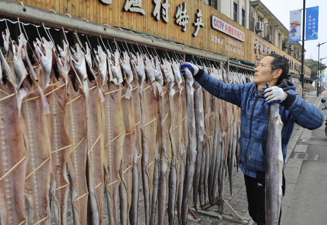 新春将至,浙江宁波市宁海县强蛟镇峡山村年味日渐浓厚,处处洋溢着繁忙喜庆的氛围。作为当地标志性的年味特产,风鳗迎来销售旺季。沿街的海货特产店人头攒动,往来顾客络绎不绝,展现出节日期间生意兴隆的喜人景象。