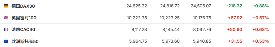 2.截至发稿,德国DAX指数跌0.88%,英国富时100指数涨0.67%,法国CAC40指数涨0.63%,欧洲斯托克50指数涨0.53%。