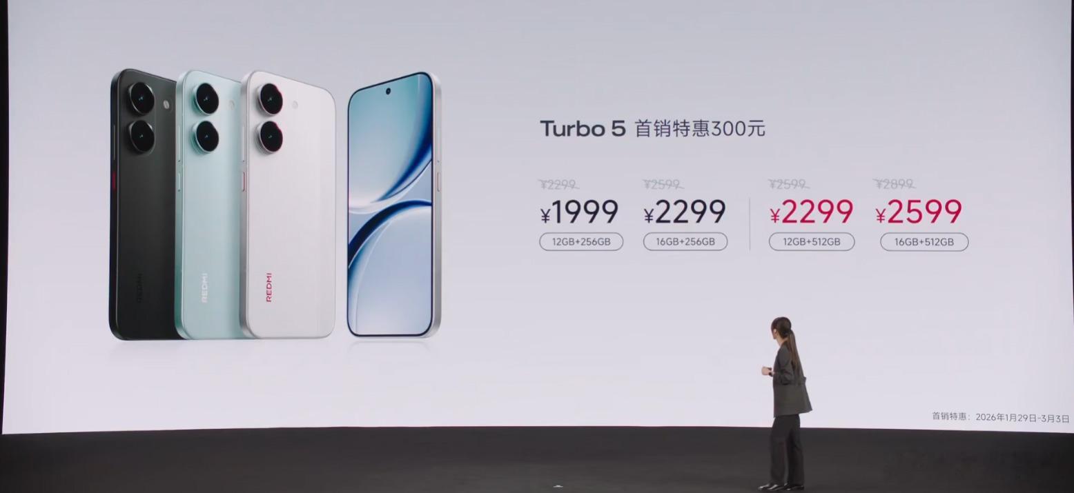 Turbo5:天玑8500,7560mAh+100W,6.59英寸1.5K屏。12+256GB 1999元;16+256GB 2299元;12+512GB 2299元;16+512GB 2599元;