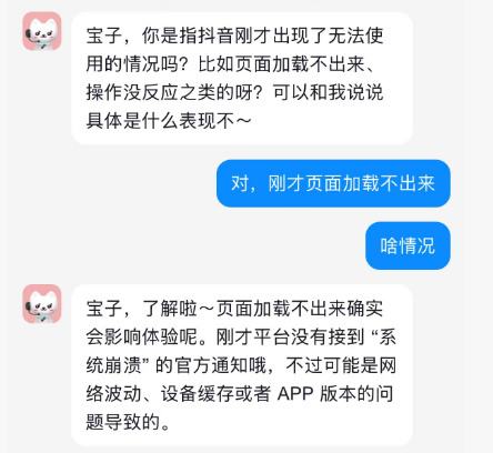 对此,抖音客服回应称:“刚才平台没有接到"系统崩溃"的官方通知,不过可能是网络波动、设备缓存或者APP版本的问题导致。建议换个网络/清理下缓存/看看APP是不是最新版本。”
