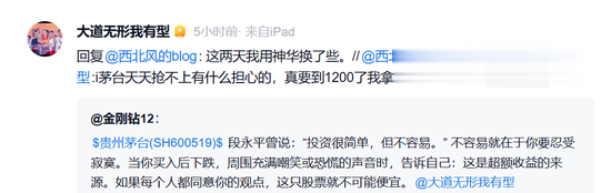 虽然表示“今天真没买”,不过段永平更早些时候透露,这两天用中国神华换了些贵州茅台。