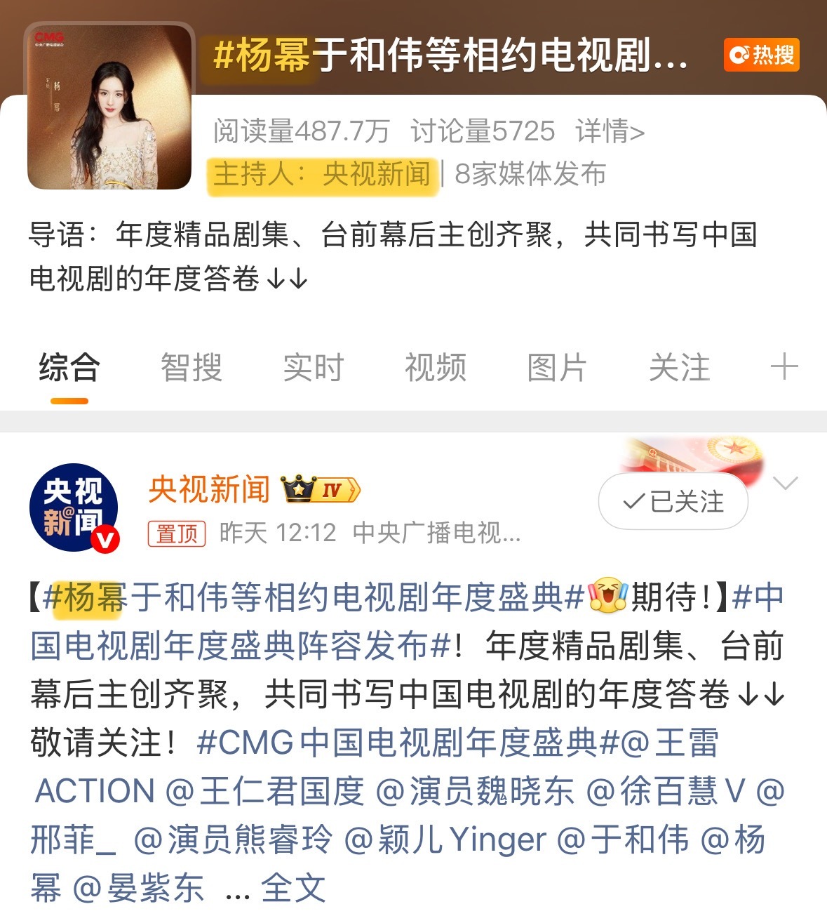 杨幂没走红毯杨幂黑长直 你也知道官媒如此郑重介绍她“杨幂等”、“杨幂…等”出席年