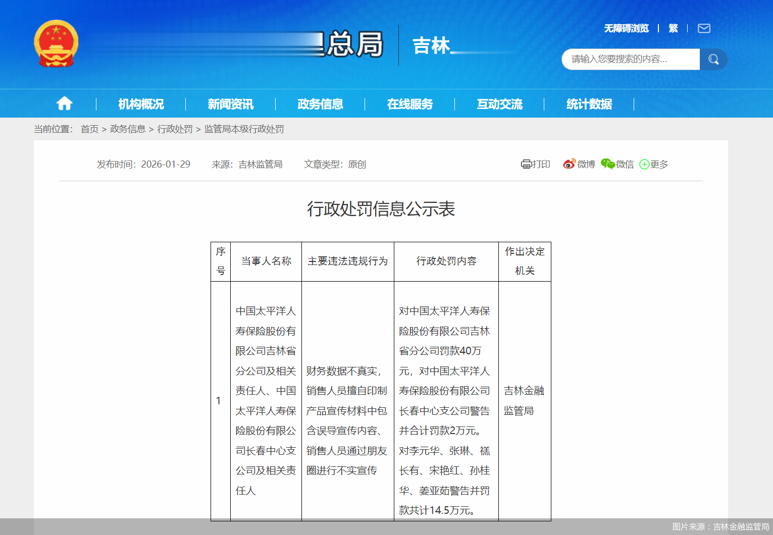 北京商报讯(记者李秀梅)1月29日,吉林金融监管局发布行政处罚信息显示,中国太平洋人寿保险股份有限公司吉林省分公司及相关责任人、中国太平洋人寿保险股份有限公司长春中心支公司及相关责任人,存在财务数据不真实,销售人员擅自印制产品宣传材料中包含误导宣传内容、销售人员通过朋友圈进行不实宣传的违法违规行为,吉林金融监管局对中国太平洋人寿保险股份有限公司吉林省分公司罚款40万元,对中国太平洋人寿保险股份有限公司长春中心支公司警告并合计罚款2万元。对李元华、张琳、禚长有、宋艳红、孙桂华、姜亚茹警告并罚款共计14.5万元。