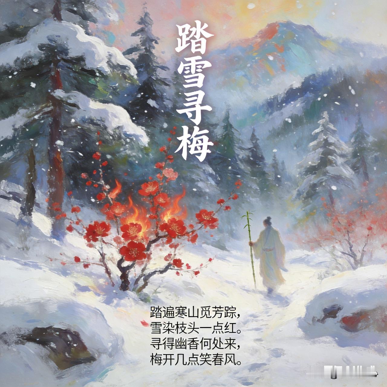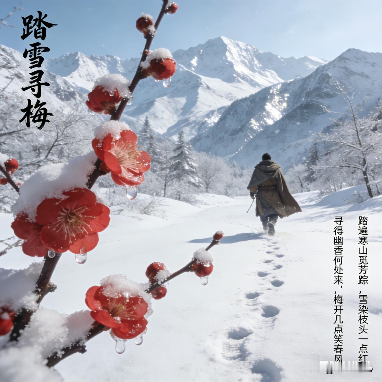 《七律*踏雪寻梅》乐韵诗心原创诗词: 踏遍寒山觅芳踪, 雪染枝头一点红。 寻得幽香何处来, 梅开几度笑春风。 这首《七律*踏雪寻梅》藏头诗,以“踏、雪、寻、梅”四字起笔,描绘了诗人踏遍寒山寻觅梅花踪迹的过程,借“枝头一点红”凸显梅花在白雪中的孤绝清丽,以“幽香何处来”强化寻觅的执着,最终落脚于“梅笑春风”的意境,既展现了梅花凌寒绽放的风骨,也抒发了诗人寻得芳踪的欣喜与对高洁品格的追慕。