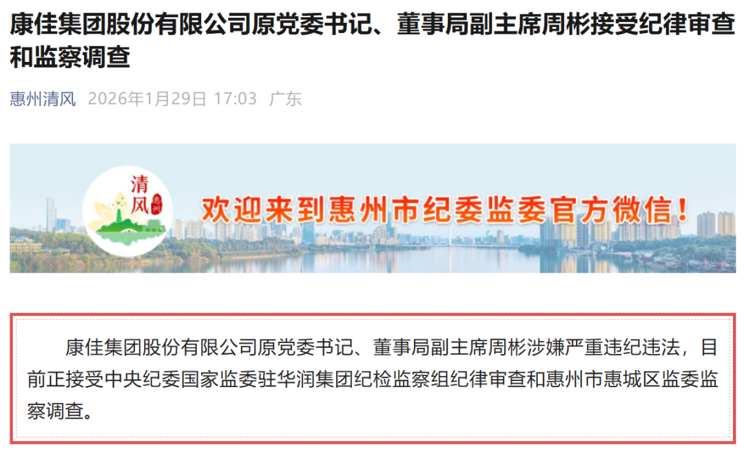 康佳集团股份有限公司原党委书记、董事局副主席周彬涉嫌严重违纪违法,目前正接受中央纪委国家监委驻华润集团纪检监察组纪律审查和惠州市惠城区监委监察调查。