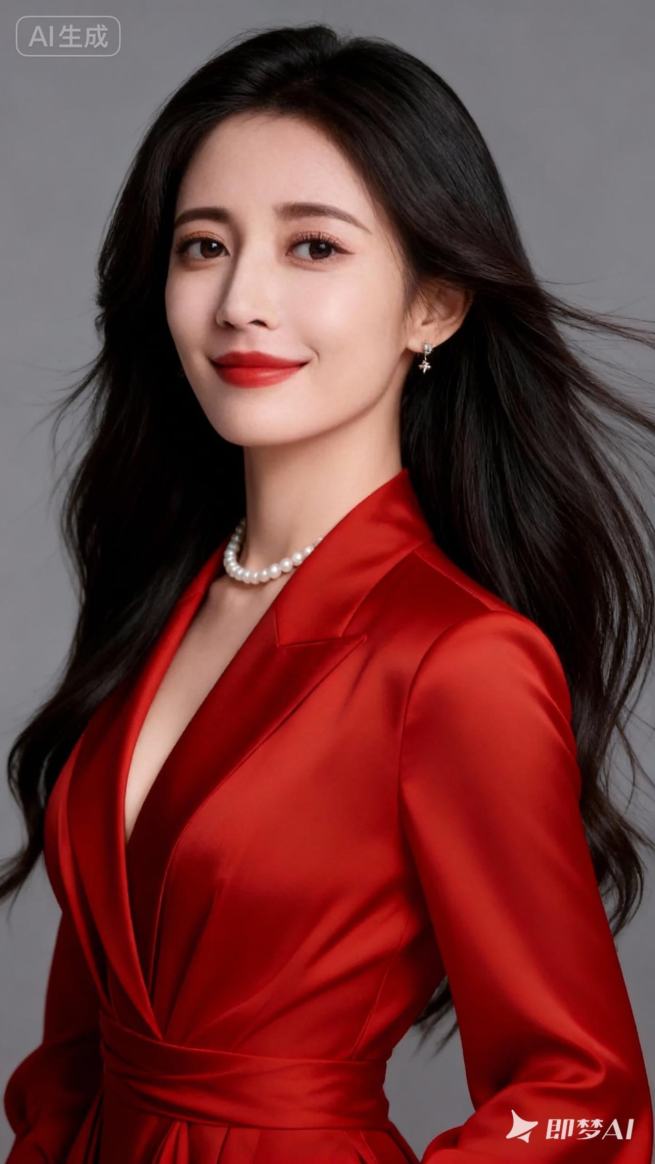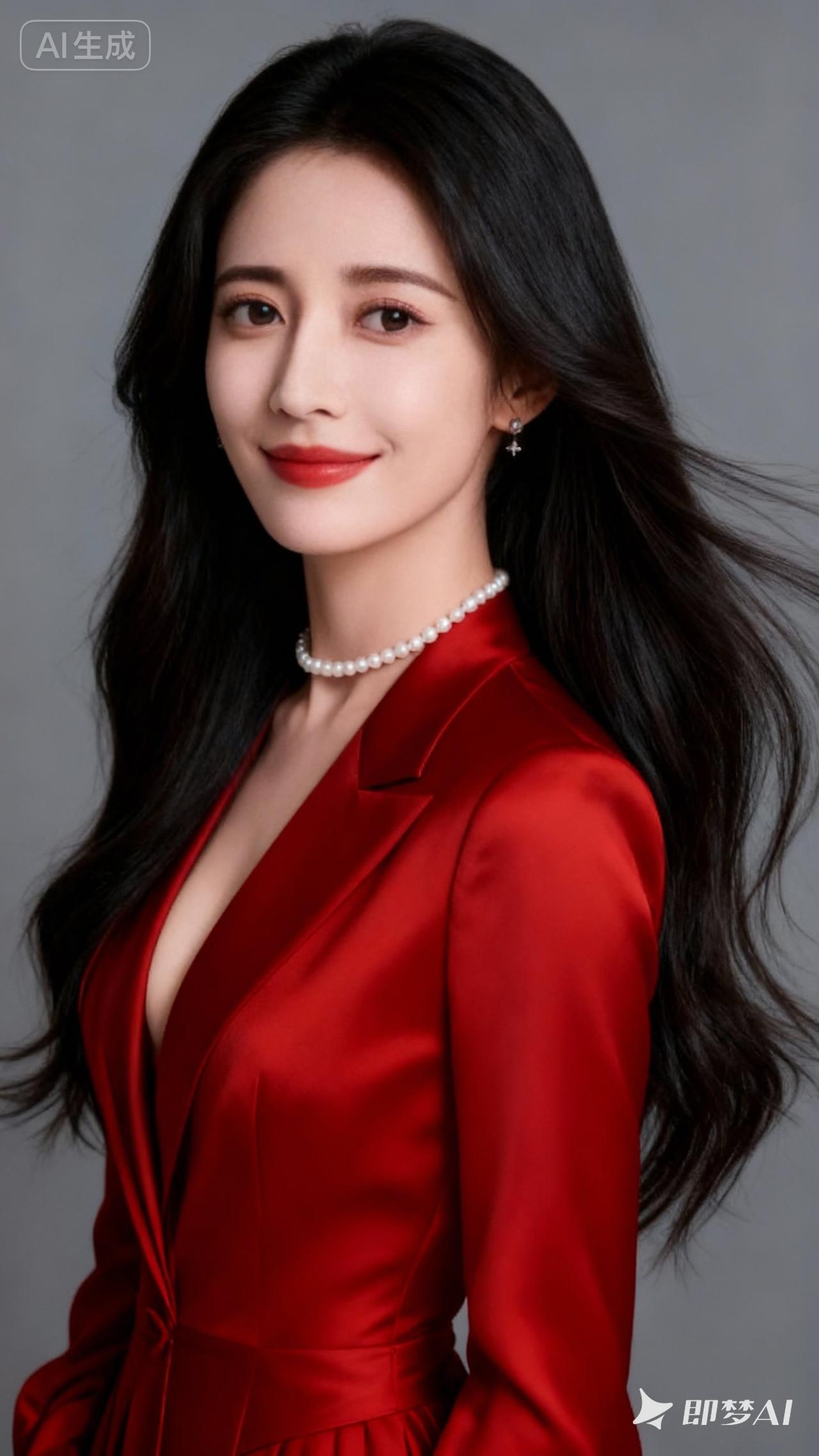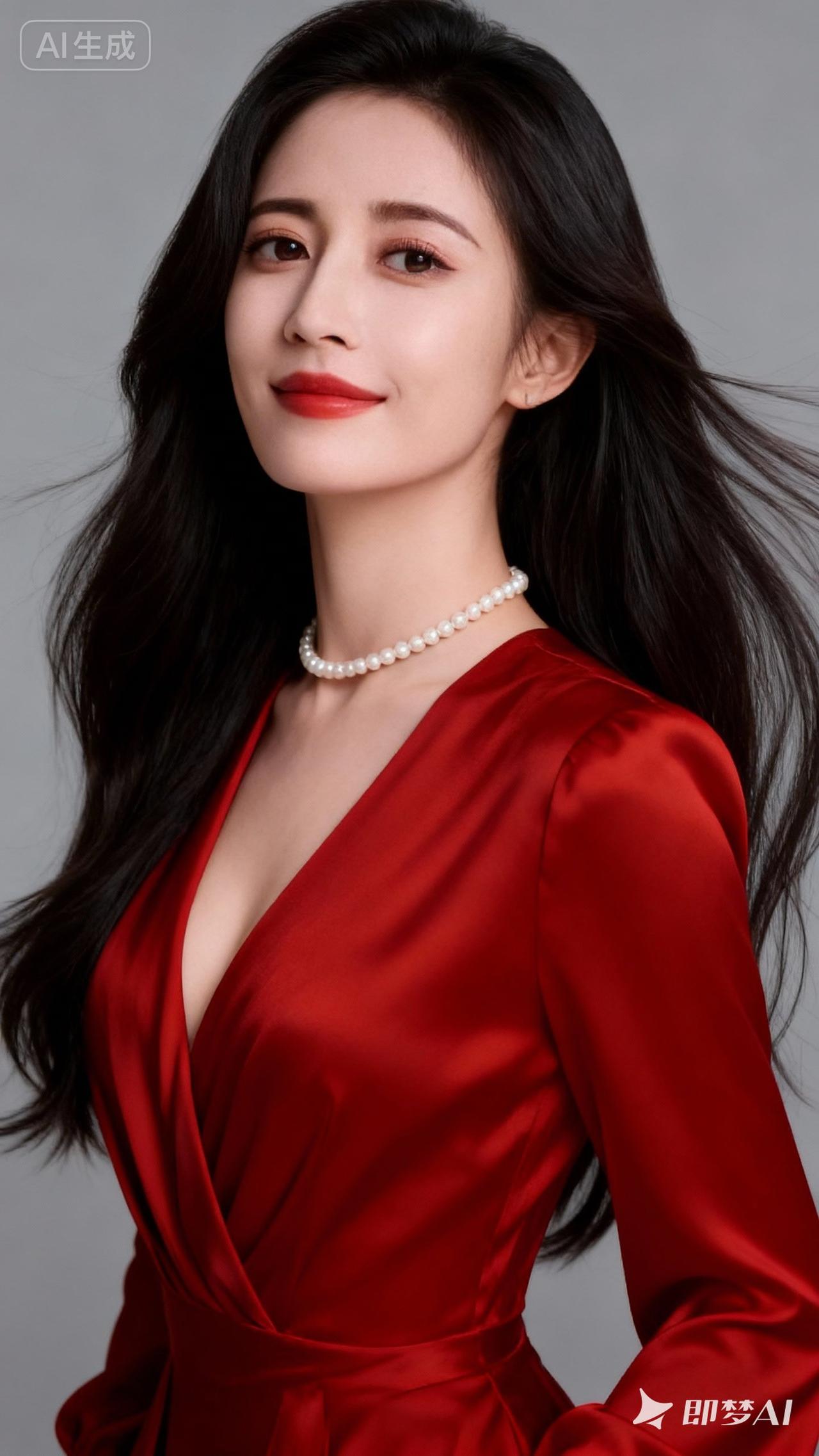 优雅红衣美人,珍珠项链点缀,尽显高贵气质!