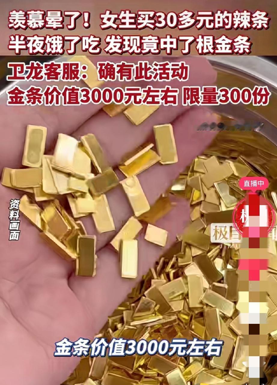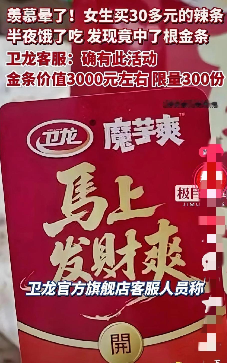 30元辣条吃出了3000元的金条!这就是运气!四川女生半夜吃卫龙竟然中了一根金条 近日,四川绵阳一位女生花30多元买的卫龙辣条礼包,竟吃出一根价值3000元的足金金条,这份天降好运让无数网友直呼“羡慕晕了”。 1月27日傍晚,绵阳杨女士下班回家,在小区楼下超市闲逛时,被一款印着“马上发财爽”字样的卫龙魔芋爽马年大礼包吸引。红彤彤的包装满是新春氛围,售价仅30余元,杨女士随手买下囤作零食,并未多想。当晚凌晨3点,饥饿感让她从睡梦中醒来,翻出礼包拆开解馋,麻辣鲜香的魔芋爽刚倒出,一张金灿灿的开奖卡片便掉了出来。 起初杨女士以为是普通广告卡,随手扫码后,手机屏幕赫然弹出“恭喜中得定制金条一份”的提示。她瞬间清醒,反复刷新页面仍不敢置信,直言第一反应是遭遇诈骗,“30块钱的辣条,怎么可能中金条这种硬通货”。为核实真假,她仔细核对活动规则,登录卫龙官网查证,还特意联系官方客服,折腾半小时才确认中奖属实。 记者随后咨询卫龙官方客服,对方证实此次金条抽奖为品牌2026马年专属活动,1月初正式启动。消费者购买指定魔芋爽马年礼包或礼盒,扫码即可参与抽奖,最高奖为999足金定制金条,正面刻有“马上发财”字样,市场价值约3000元,全国限量仅300份,中奖名单后续会在官网公示,奖品将在30个工作日内邮寄,全程由第三方机构监管保障公平。 运气来了挡都挡不住,一根辣条竟然吃出了一根金条,真的是太惊喜了!全国只有300份,这中奖概率简直低到尘埃里了,网友们都直呼羡慕。这也是我们生活中的小惊喜,但是网友们也别盲目跟风囤货,我们还是应该多一些理性。同时也希望我的友友们在新的一年里都能收获生活里的小确幸,小惊喜。