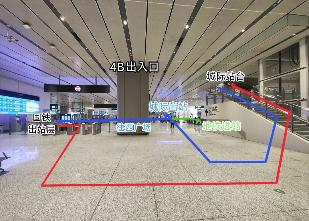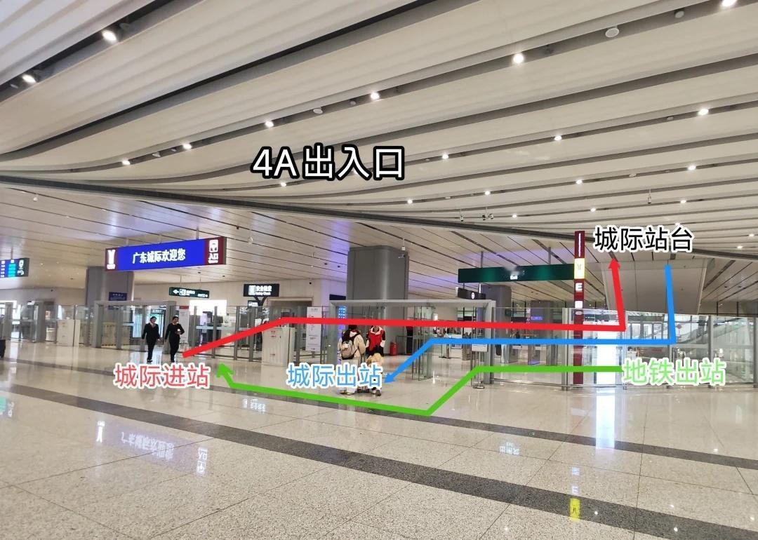 城际广州白云站 4A站厅:城际进站、出站。地铁E口只出不进,地铁换乘城际需重新安