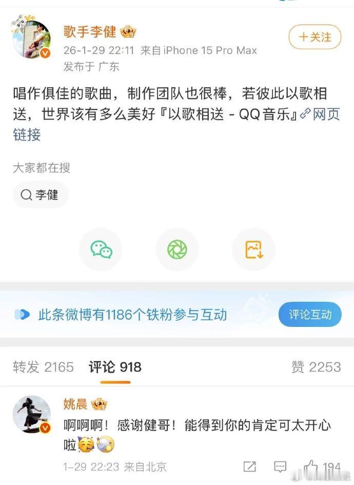 李健说姚晨的新歌唱作俱佳李健宣传姚晨新歌谁懂啊!李健亲自宣传姚晨新歌还夸唱作俱佳,这波神仙友谊也太好磕了,立马去冲《以歌相送》