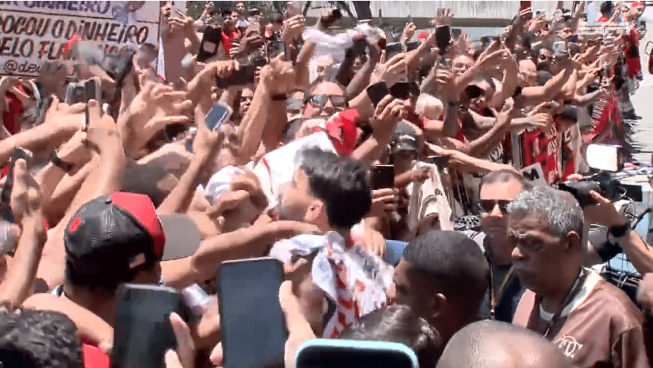 现场气氛彻底“失控”。帕奎塔径直跑向球迷,投入“民族(NaçãoRubro-Negra)的怀抱”,与多名支持者拥抱,引发到达区的巨大欢呼。