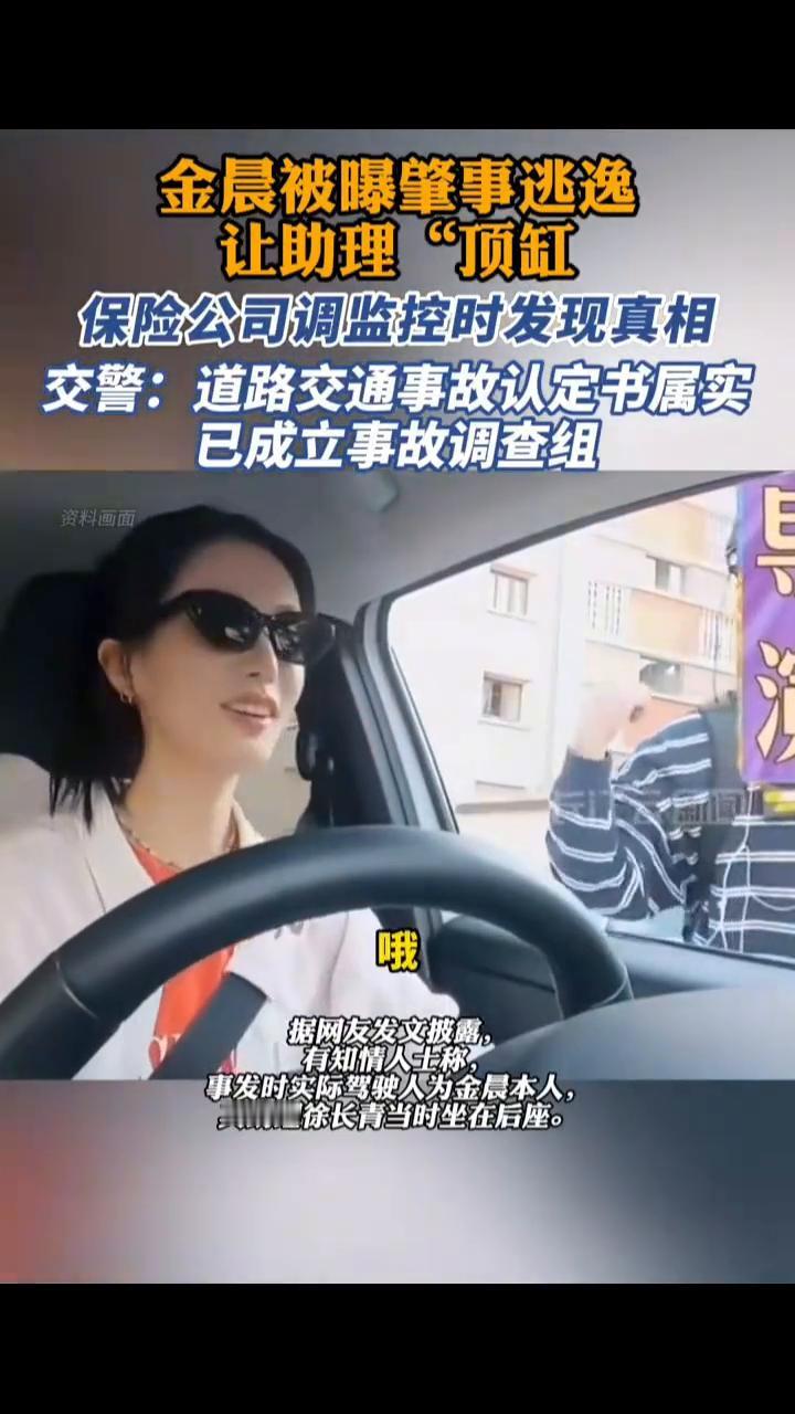 金晨被曝肇事逃逸,让助理"顶缸",保险公司调监控时发现真相。交警:道路交通事故认定书属实,已成立事故调查组。 长江云新闻。 1月29日,据大皖新闻报道,话题曝金晨肇事逃逸、金晨疑似涉嫌交通肇事逃逸登上热搜。 节目导演:逆行啊! 有知情人士称,演员金晨于2025年3月16日在浙江省绍兴市柯桥区发生交通事故,涉嫌交通肇事逃逸。截至目前,金晨方面尚未作出回应。 据网友发文披露,事发时实际驾驶人为金晨本人,其助理徐长青当时坐在后座。事故发生后,金晨与经纪人随即离开现场,留下助理徐长青处理后续事宜,并应对交警调查。在事故处理结束后,保险公司在理赔调查阶段调取交警监控时发现,实际驾驶人并非徐长青,而是车主金晨本人,保险公司随后向交警部门报案。 1月29日,记者就此事联系绍兴交警,得知事发地点"柯桥区湖塘街道岭下村"属于绍兴交警柯南中队管辖范围。 据潇湘晨报,1月29日下午,柯桥区柯南中队交警告诉记者,绍兴市公安局柯桥区分局正在调查中,可以联系分局了解。 另据中国蓝新闻,柯南中队交警回复:公开资料显示,金晨出生于1990年9月5日,籍贯山东省济南市、毕业于北京舞蹈学院民族舞专业,是中国内地影视女演员,曾出演《无心法师》、《萌妃驾到》等作品。