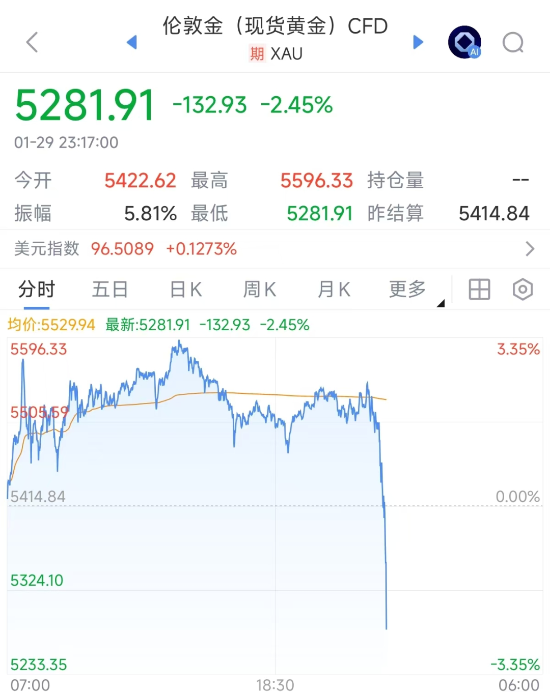 1月29日晚,现货黄金白银快速走低,回吐盘中全部涨幅。截至发稿,现货黄金跌破5300美元/盎司,盘中一度涨超3%。