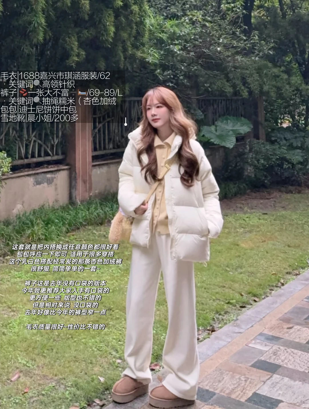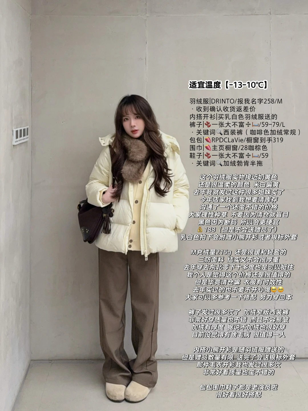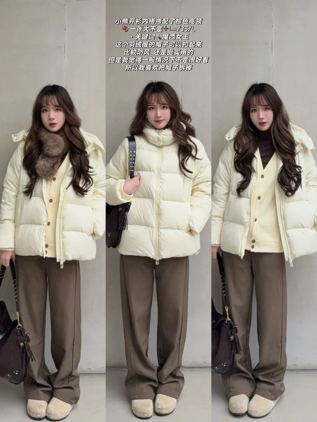 168/104 【敞怀仅仅是为了展示内搭 有拉上拉链的图】 【纯分享 理性种草 不要盲目 收到合适就留不合适就退】 【参考温度仅供参考 天冷加衣注意保暖】 去年发过的羽绒服 今年又发一次 因为真的还蛮合适的~ 这个价格买到正儿八经的羽绒 我自己觉得很划算 这一期算奶白色/奶黄色羽绒服搭配思路 因为这个羽绒服实物是偏黄的 所以奶黄色也通用 我觉得各方面性价比还不错 如果正好缺一件这种羽绒服 可以考虑入手(„• ֊ •„)੭ 但是如果有类似的 没必要买了 参考搭配就行~