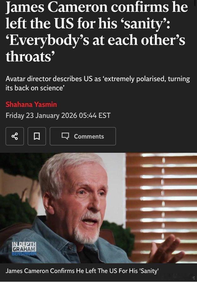詹姆斯·卡梅隆移民新西兰最近(2026年1月23日左右)接受Graham Bensinger的“In Depth”节目采访,亲口确认他已经永久移居新西兰,主要就是为了“sanity”(理性、清醒、神智正常)卡梅隆直球批评美国现在像“反复观看一场车祸”(like watching a car crash over and over),极度撕裂(everybody’s at each other’s throats)、互相攻击、政治极化、背离科学(turning its back on science),如果再来一场疫情,美国会彻底混乱(utter disarray)。当主持人说“美国还是个好地方,新西兰风景美”,卡梅隆怼回去:“我不是为了风景去的,我是为了sanity去的!”(I'm not there for the scenery, I'm there for the sanity.)——这“sanity”用得太狠太呼应“san值”梗了,早把特朗普时期美国政治氛围形容成精神病院!他早就计划移居新西兰(拍《阿凡达》时买地建农场),疫情+特朗普政治疯狂加速决定,新西兰公民身份“即将获得”(imminent),全家打包滚蛋,早不回头。热点观点海外新鲜事